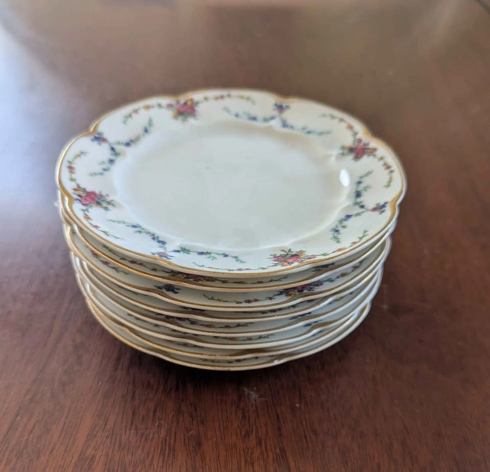 Eight vintage dessert or bread plates. These elegant plates feature a delicate floral garland pattern and a scalloped edge with gold trim. Approximately 6.5 inches in diameter.