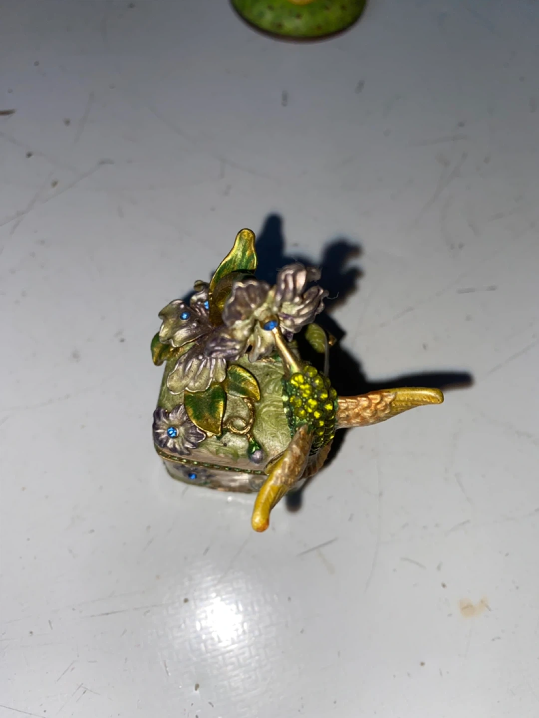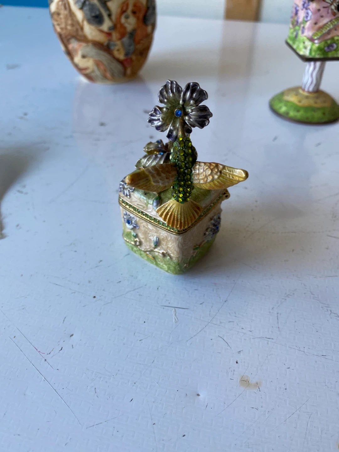 60This is a beautiful enamel trinket box. It's decorated with a flower on top and has a detailed design. It would be perfect for storing small jewelry or other precious items