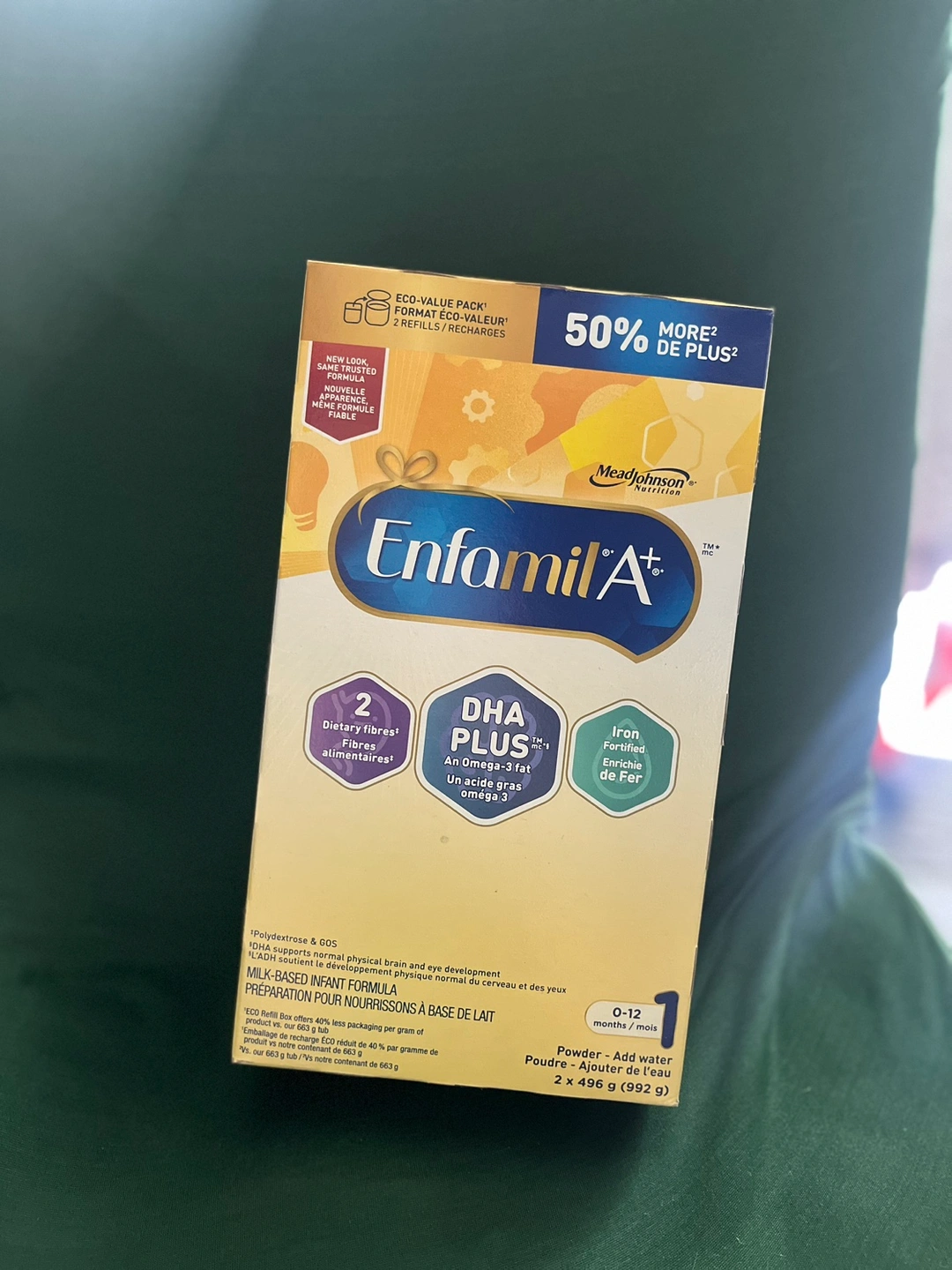 A box of Enfamil A+ infant formula, suitable for babies aged 0-12 months. Brand new, never been opened. Currently switching to a different formula for my 2 month old and no longer have a use for this.