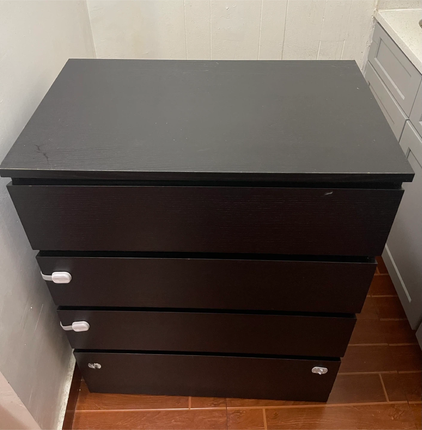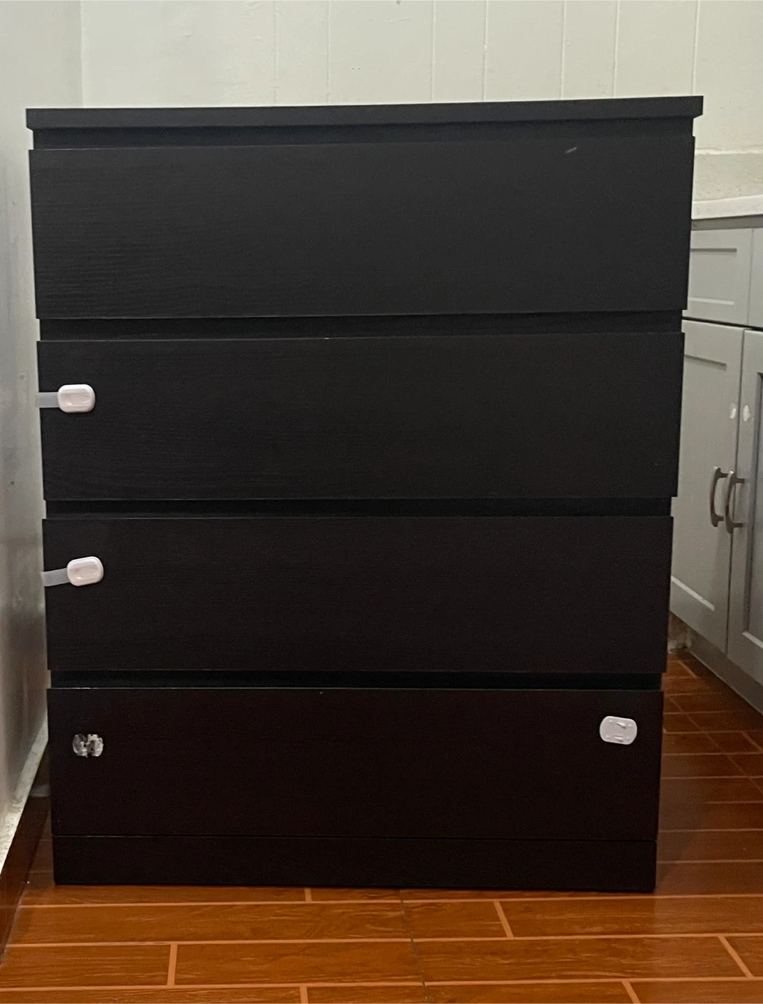 This is a black dresser with four drawers. It's made of wood-composite material. Drawer pulls are white.