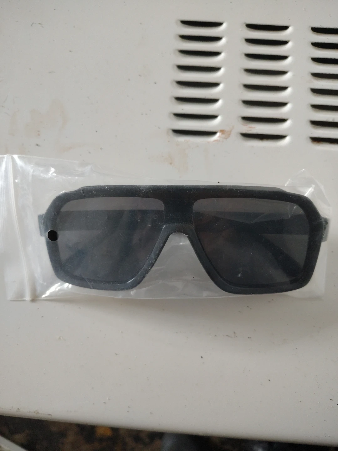 Black oversized square sunglasses. They're in a plastic bag, ready to protect your eyes. Plastic frame and lenses.
