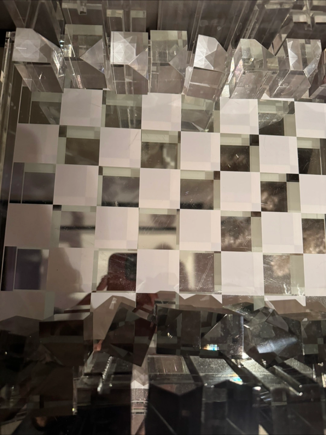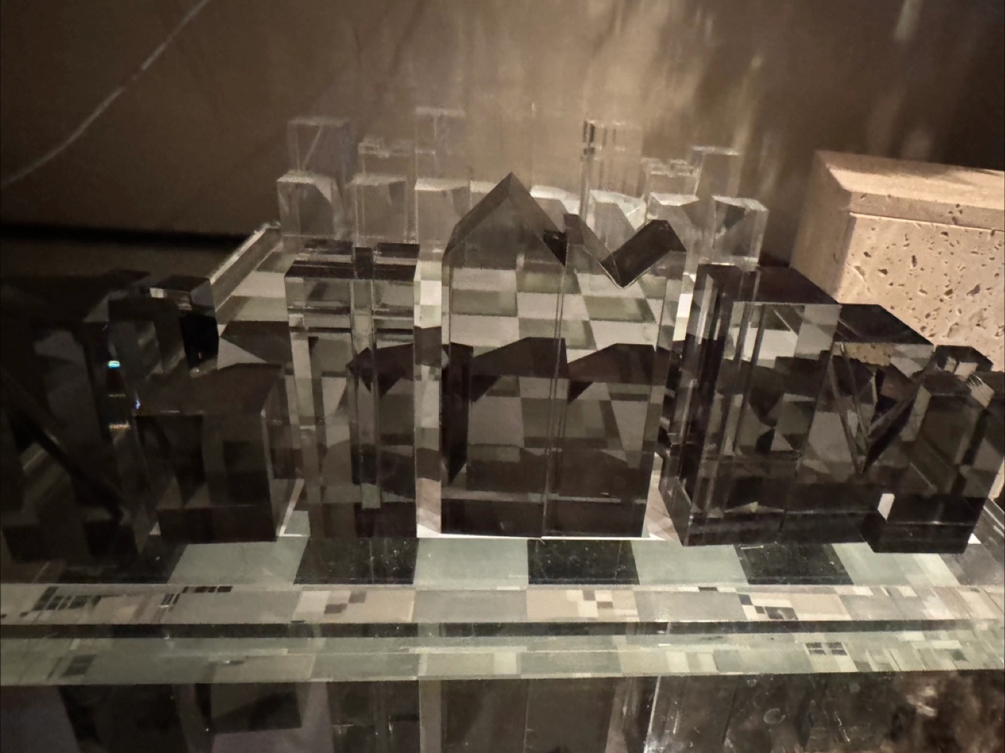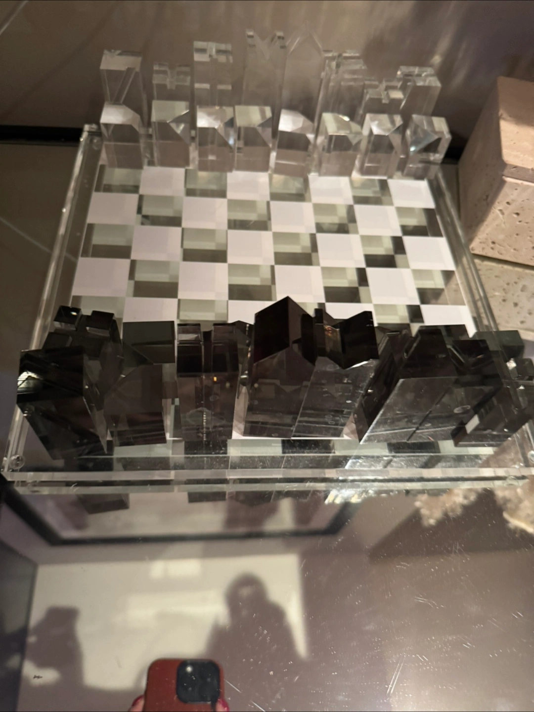 Unique Clear and Smoke Grey Acrylic Chess Set. Modern architectural design. Glass Perfect for collectors or modern home decor.