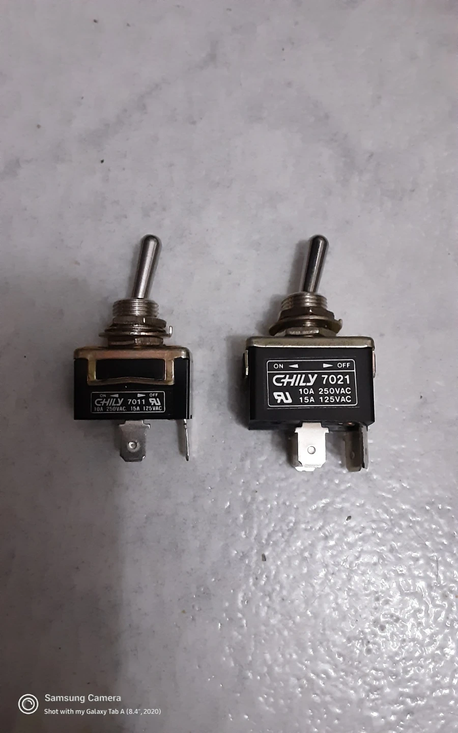 Selling two CHILY toggle switches, models 7011 and 7021. The 7011 is rated 10A 250VAC and 15A 125VAC. The 7021 is also rated 10A 250VAC and 15A 125VAC. These are standard SPST on/off toggle switches.