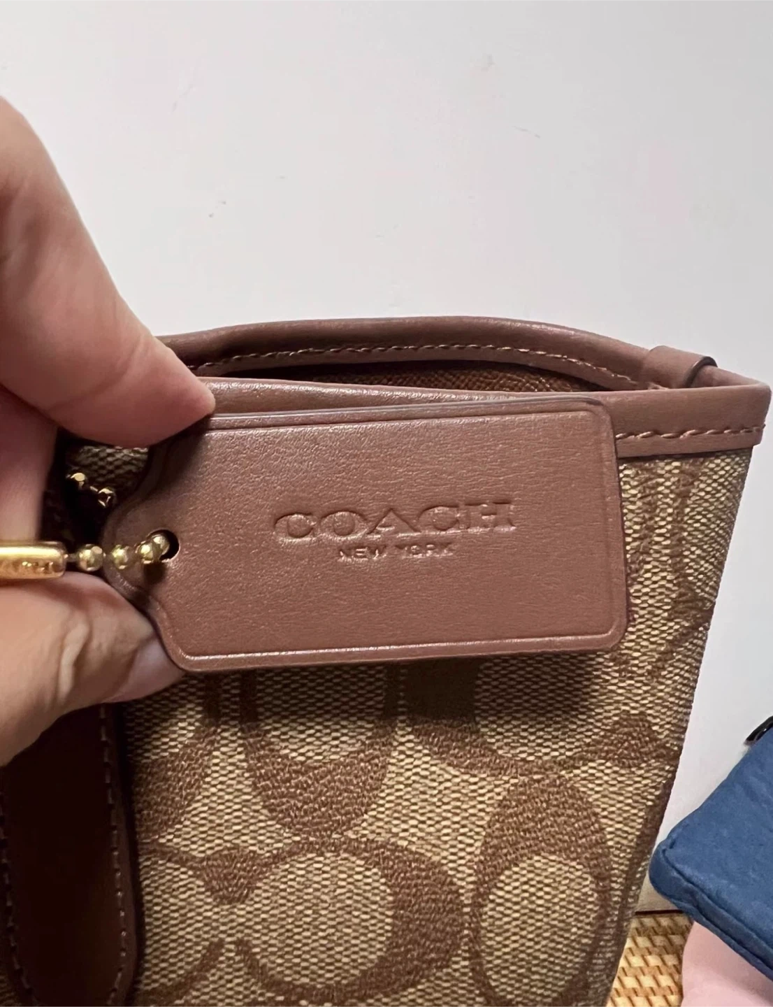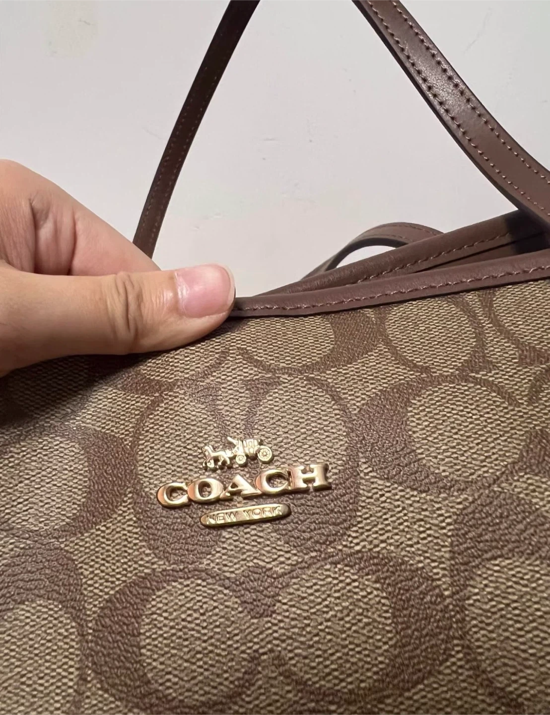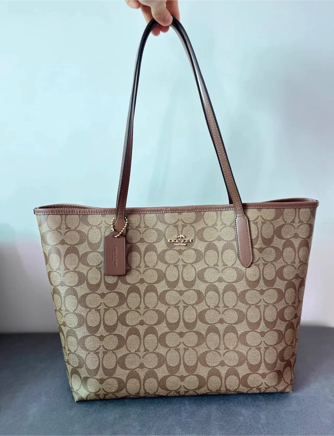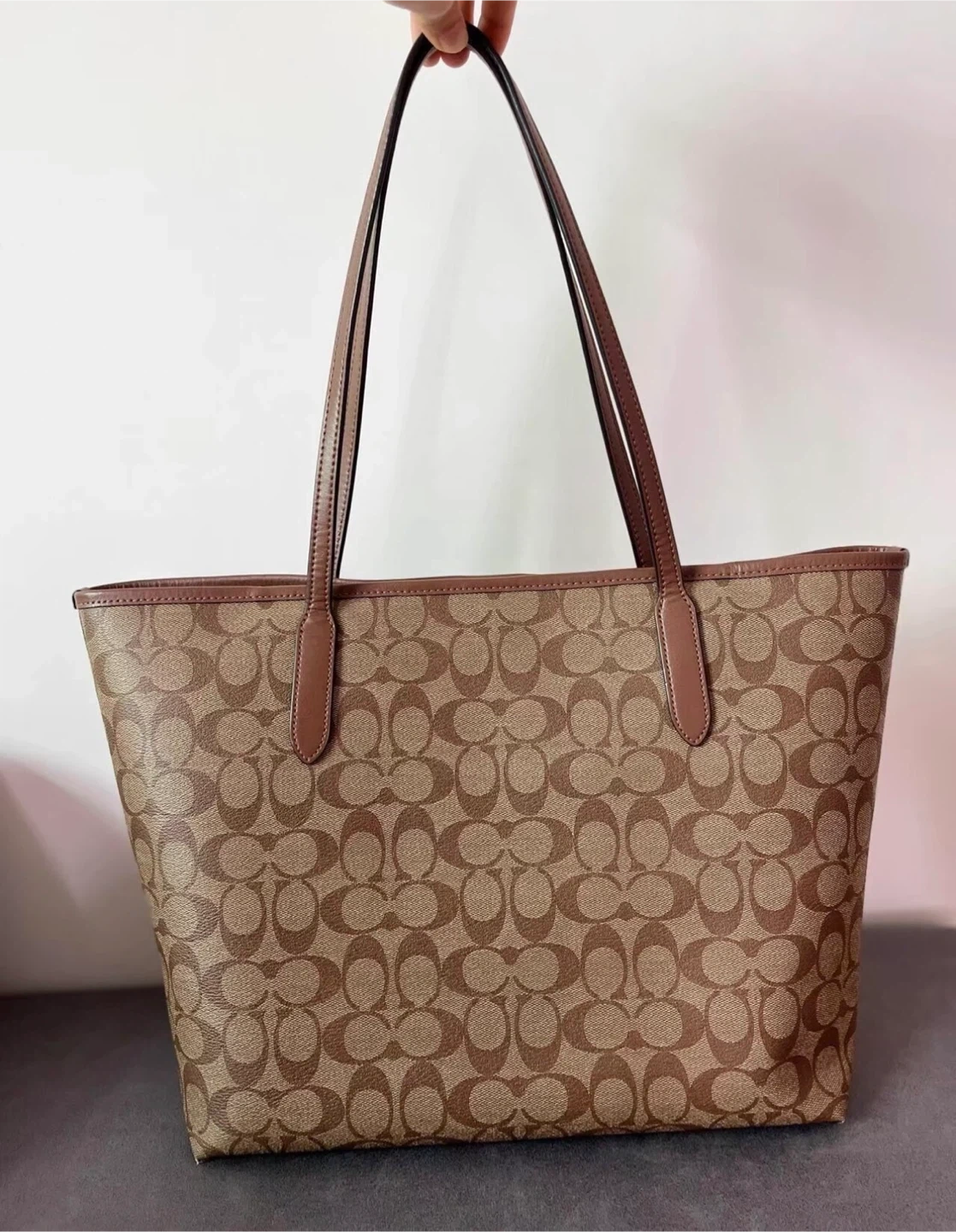 A classic Coach tote bag with the signature "C" pattern. It's perfect for everyday use, offering ample space for your essentials. The bag is made with durable material and features comfortable leather straps.