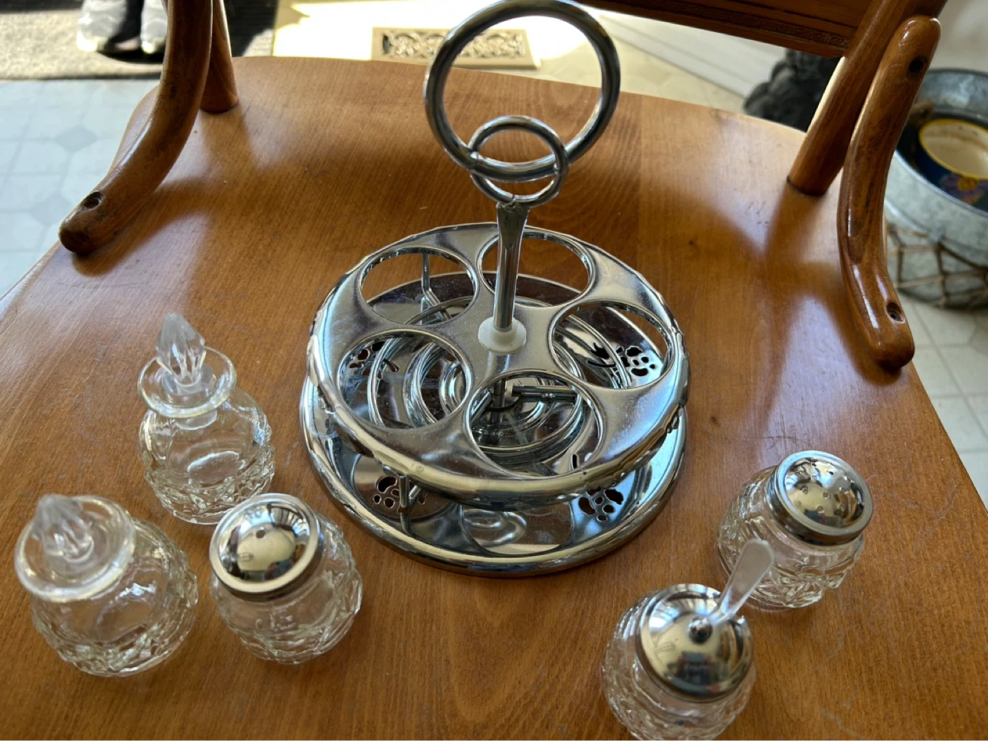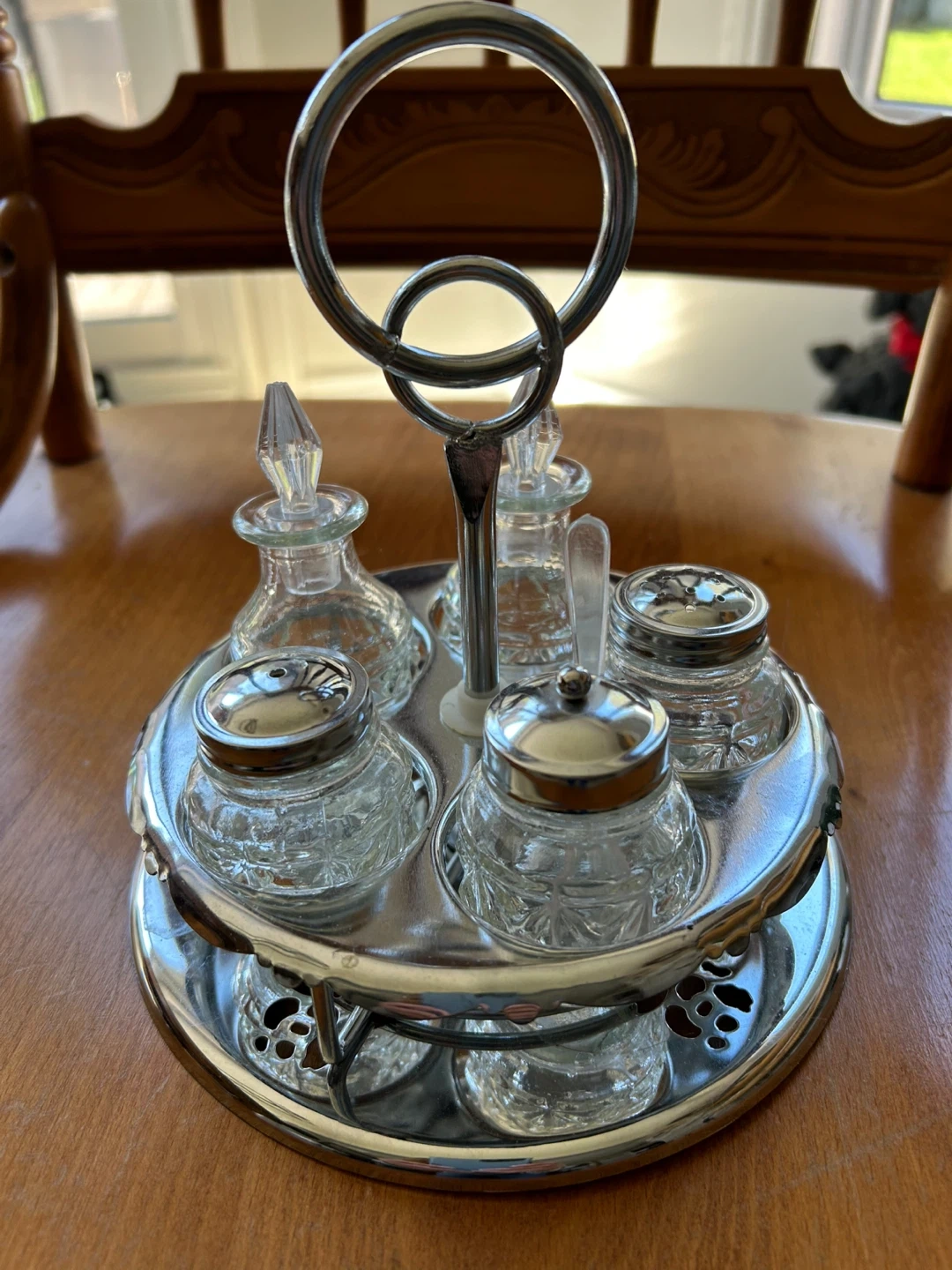 SMALL VINTAGE STAINLESS STEEL CRUET SET (SEE LISTING)
