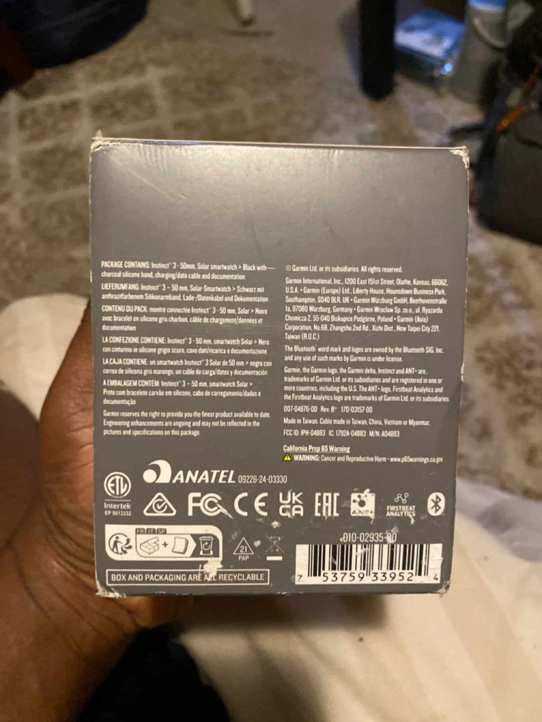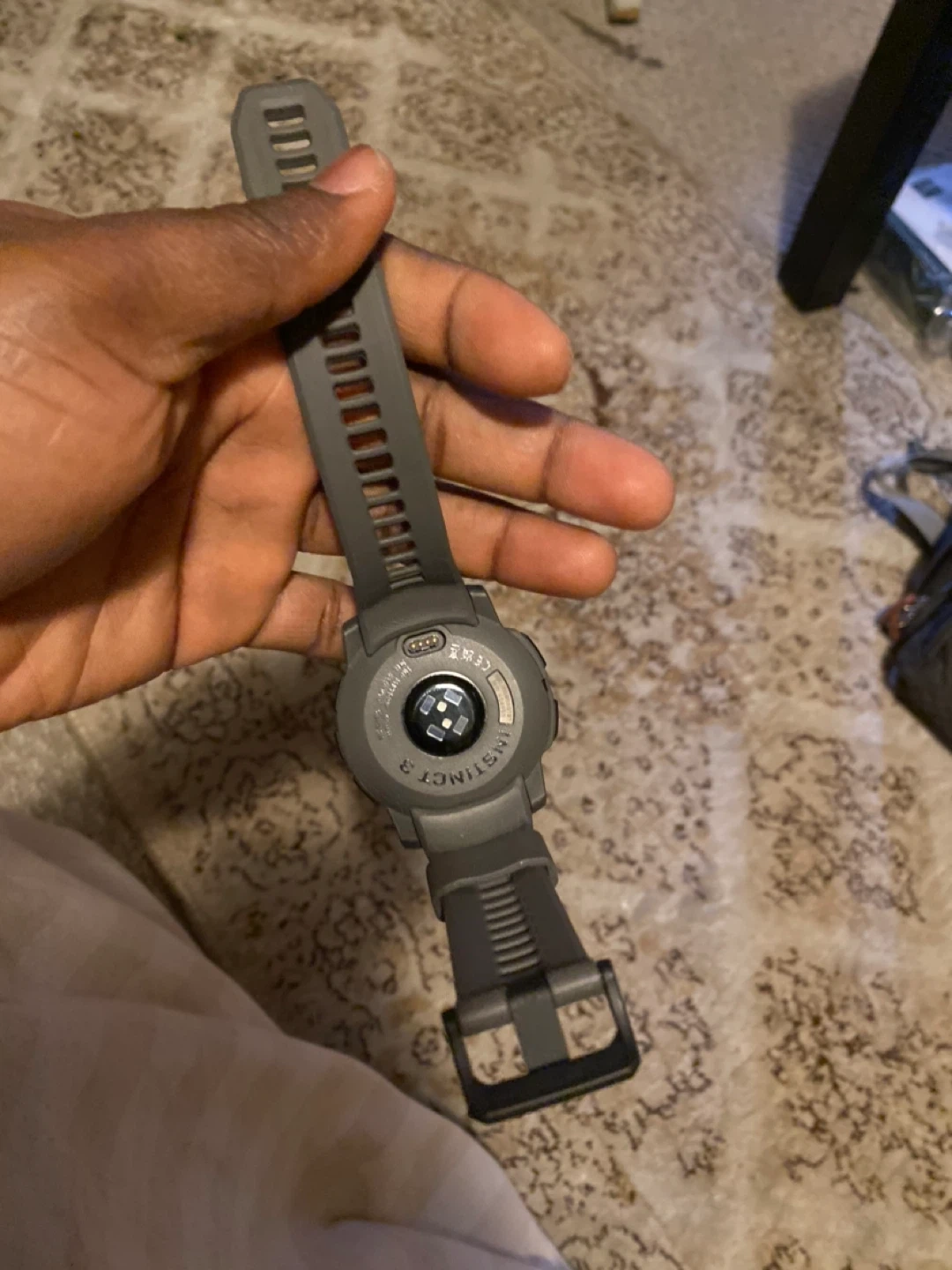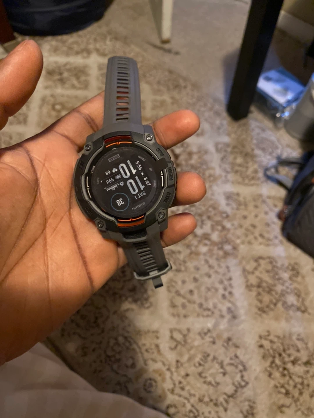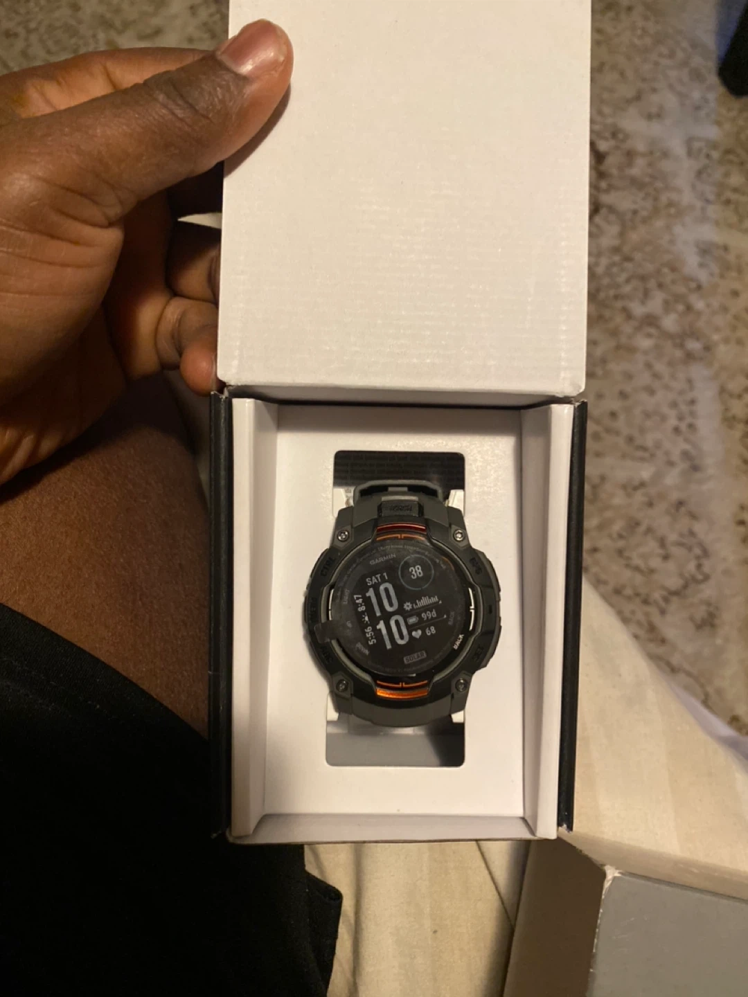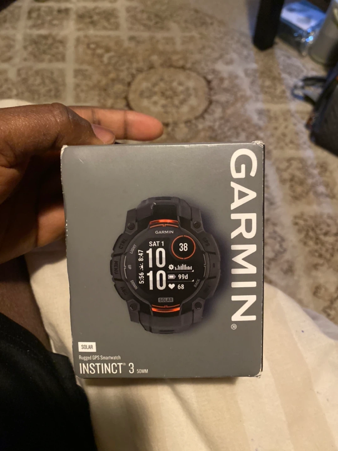 Garmin Instinct 3 Solar rugged GPS smartwatch. Includes charging cable and documentation. This watch is great for outdoor adventures and tracking fitness metrics. It's built tough for any environment!