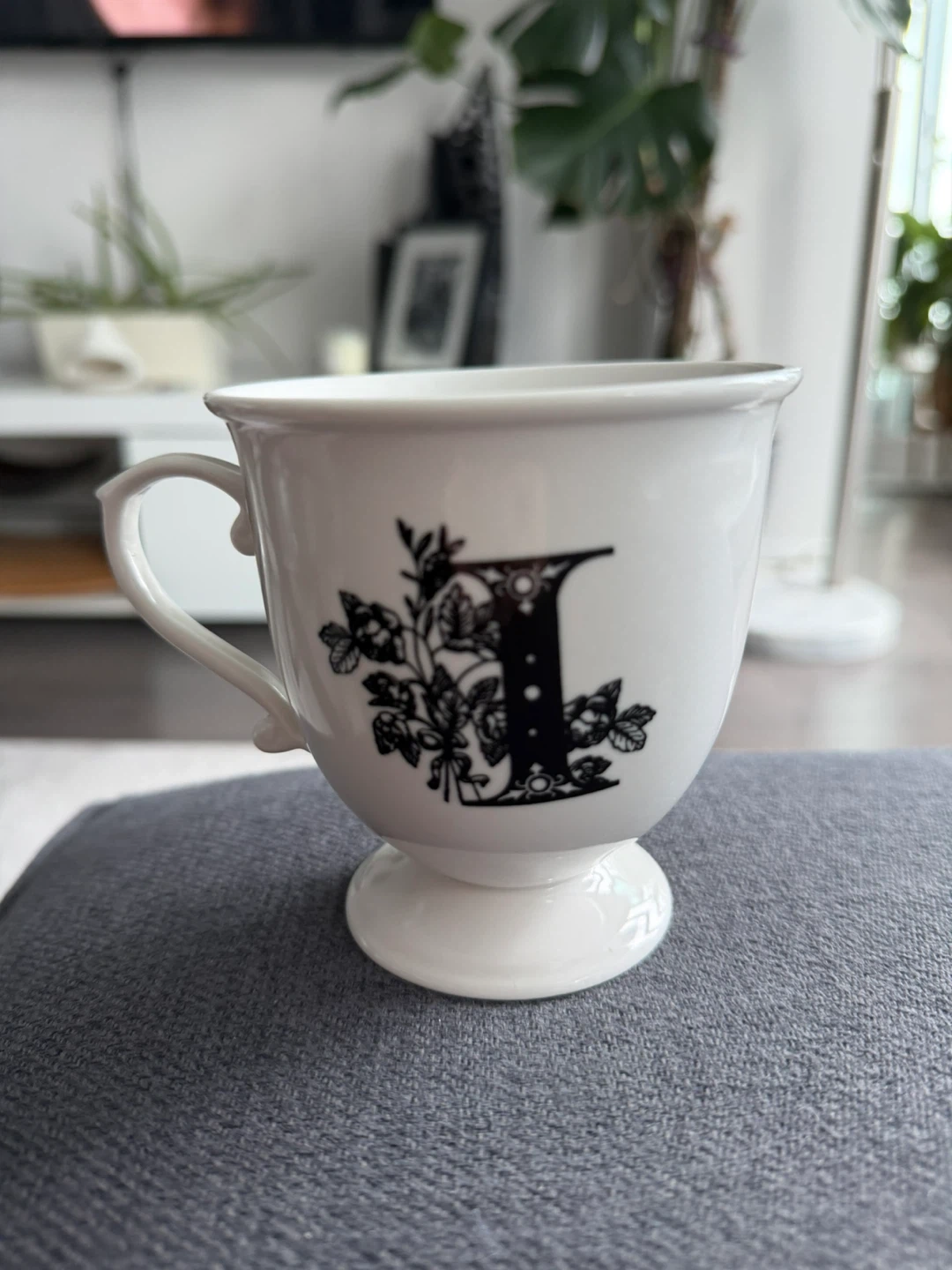 Here's a cute white mug with a decorative initial 'I' design! It's perfect for adding a personal touch to your morning coffee or tea
