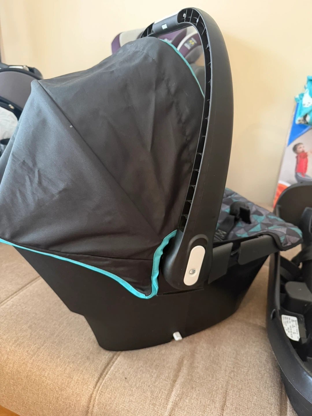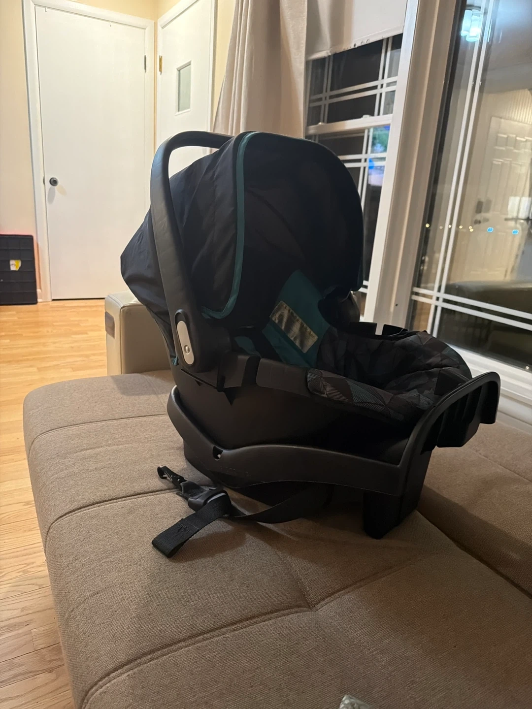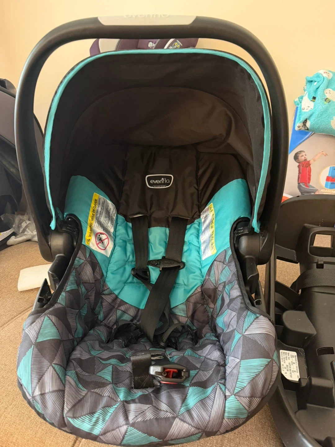Base y asiento infantil para automóvil Evenflo Nurture Max. Presenta un patrón geométrico verde azulado y gris. Fabricado el 2024-06-03. Fecha de caducidad 2030-05-29. Libre de humo y mascotas listas para un nuevo hogar.