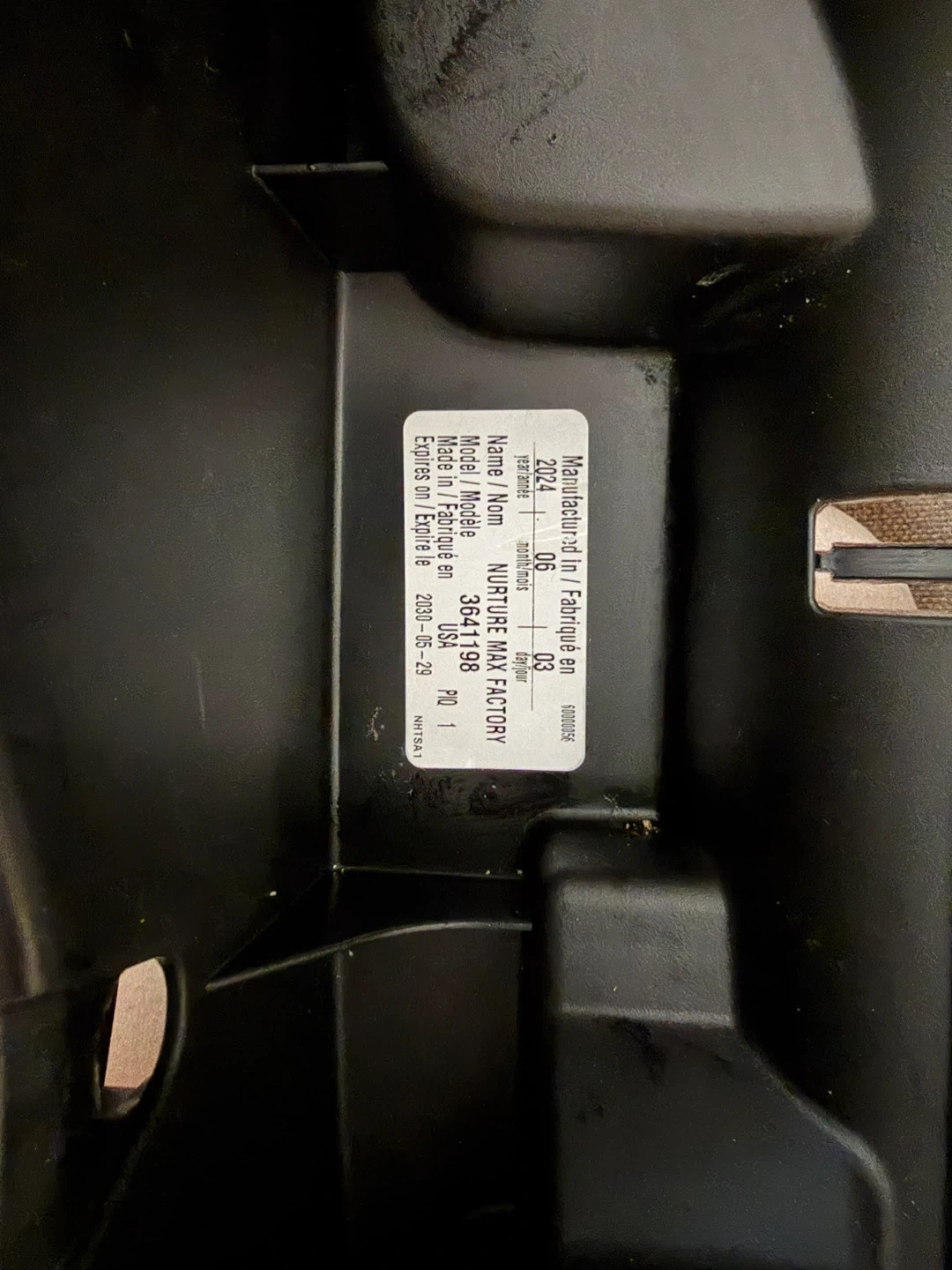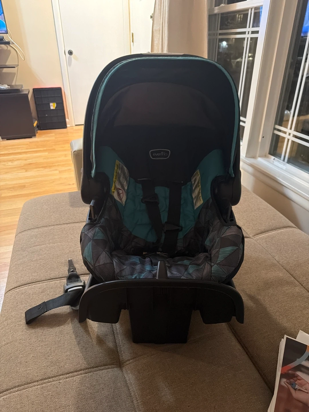 Evenflo Nurture Max Infant Car Seat and Base. Features a teal and gray geometric pattern. Manufactured on June 3, 2024. Expiration date: May 29, 2030. Smoke-free and pet-free; ready for a new home.