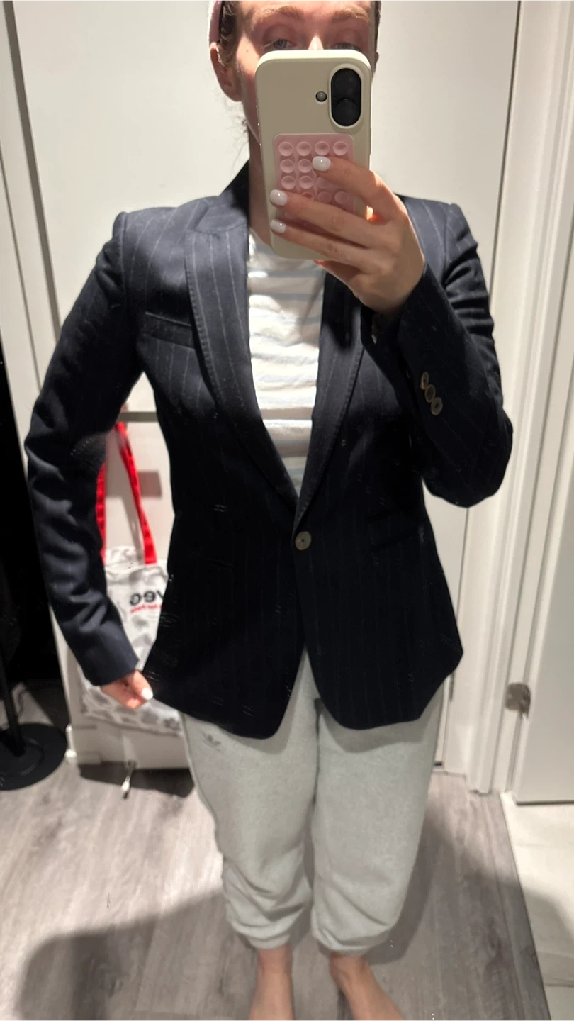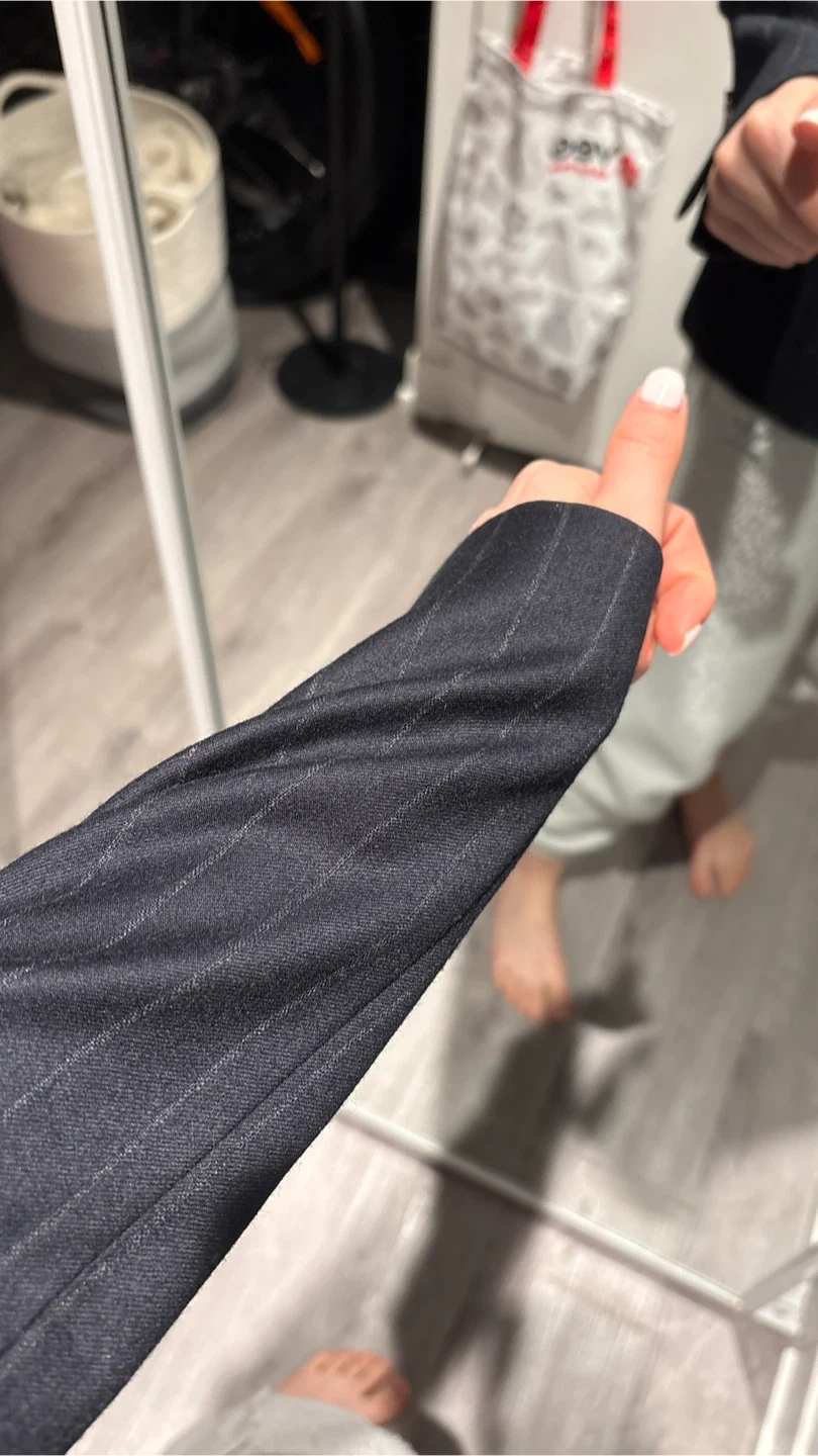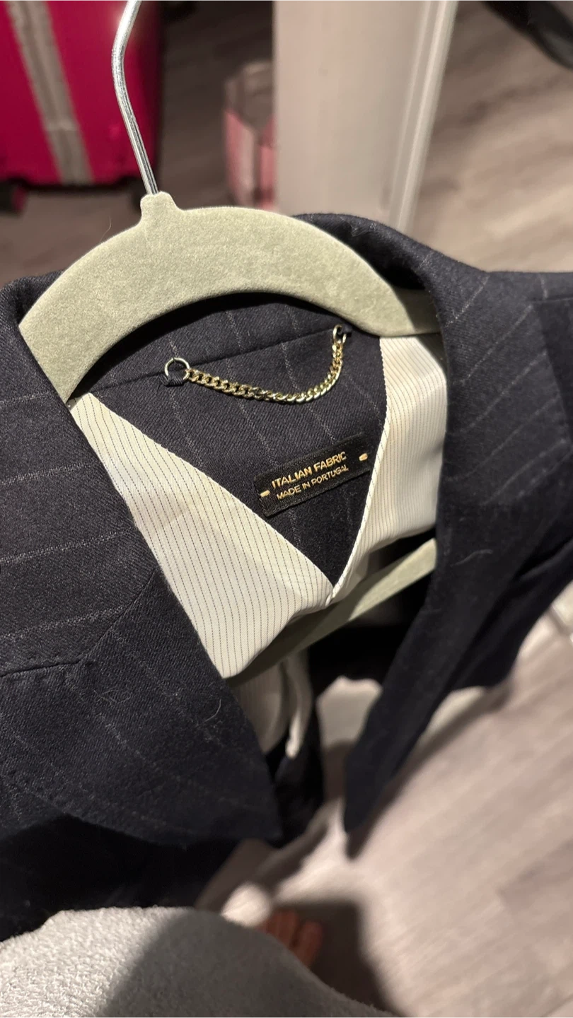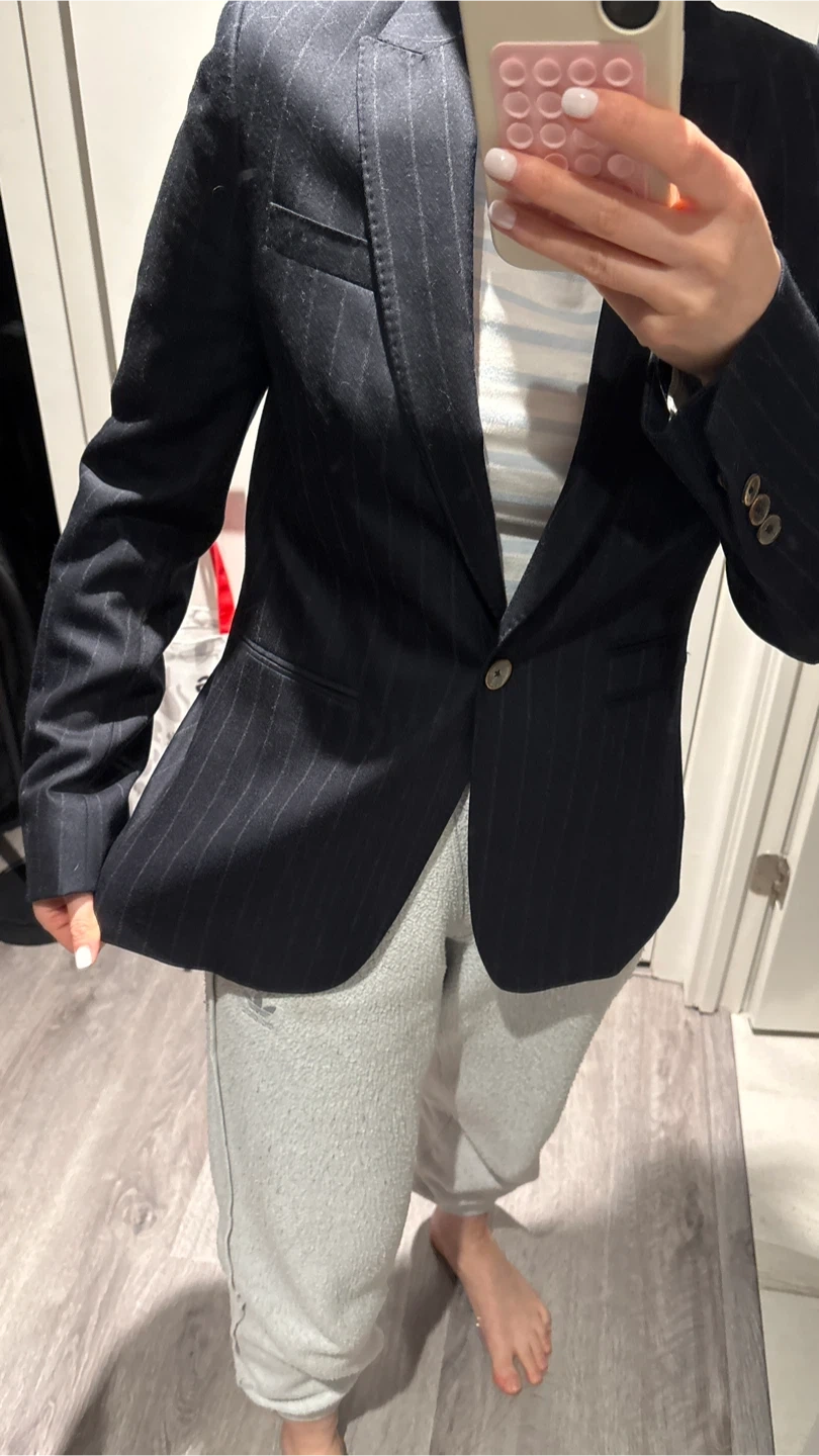 This is a Massimo Dutti navy pinstripe blazer. Made with Italian fabric. It's great for layering over outfits to add a touch of sophistication. A classic piece for any wardrobe!