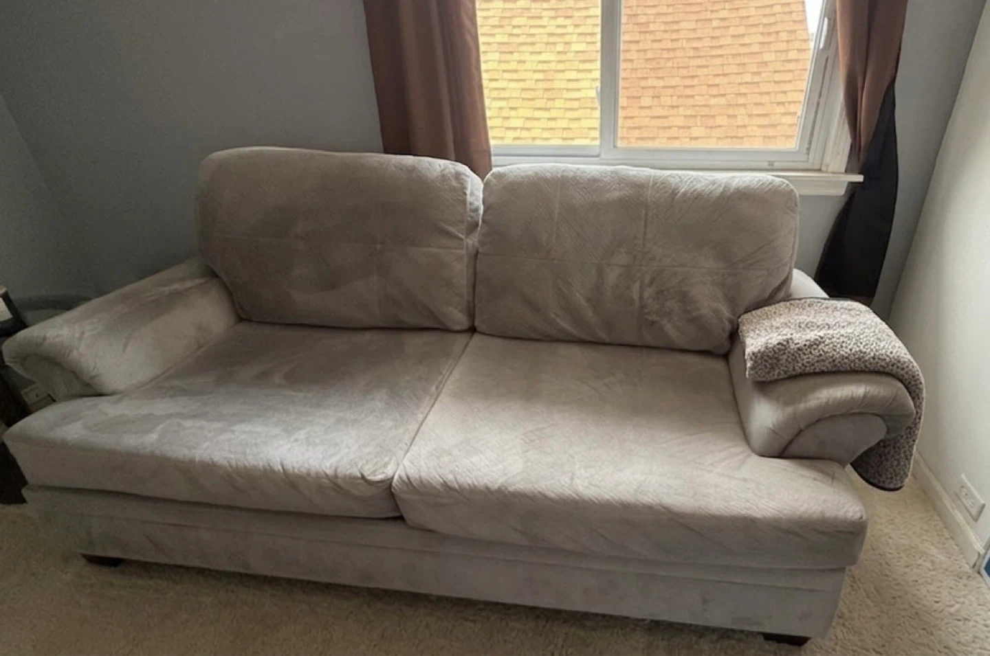 Very comfortable grey sofa with soft, microfiber-style upholstery. Deep cushions make it perfect for lounging, or a gaming room!