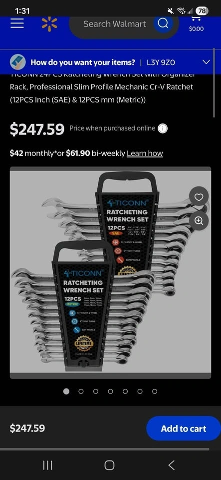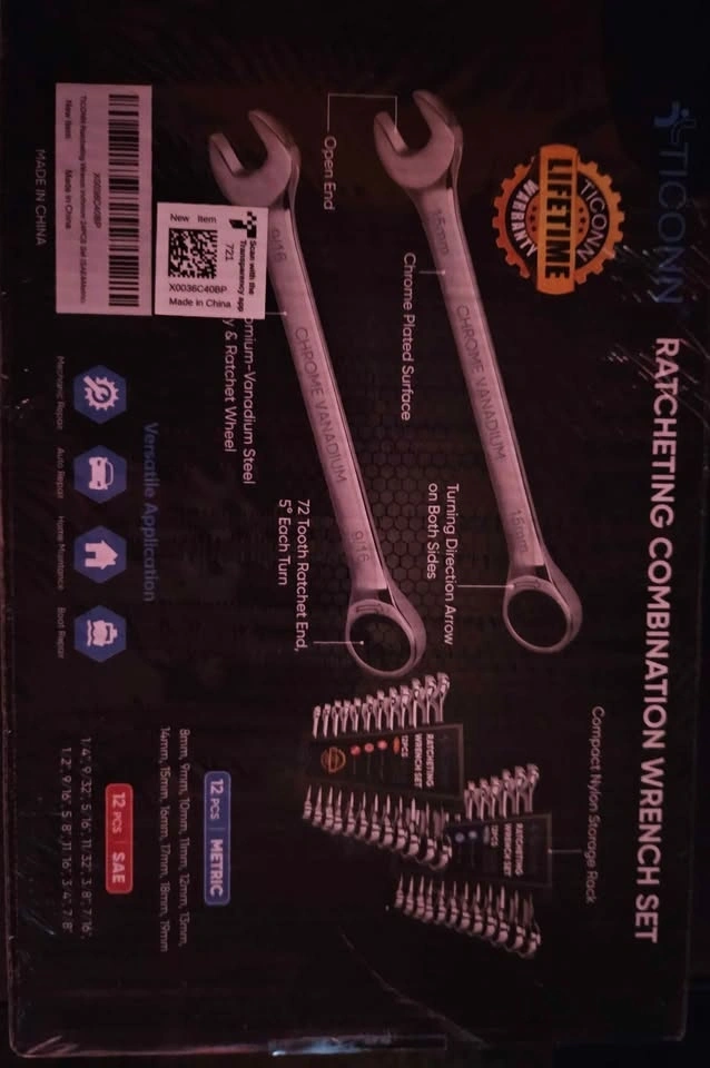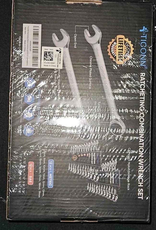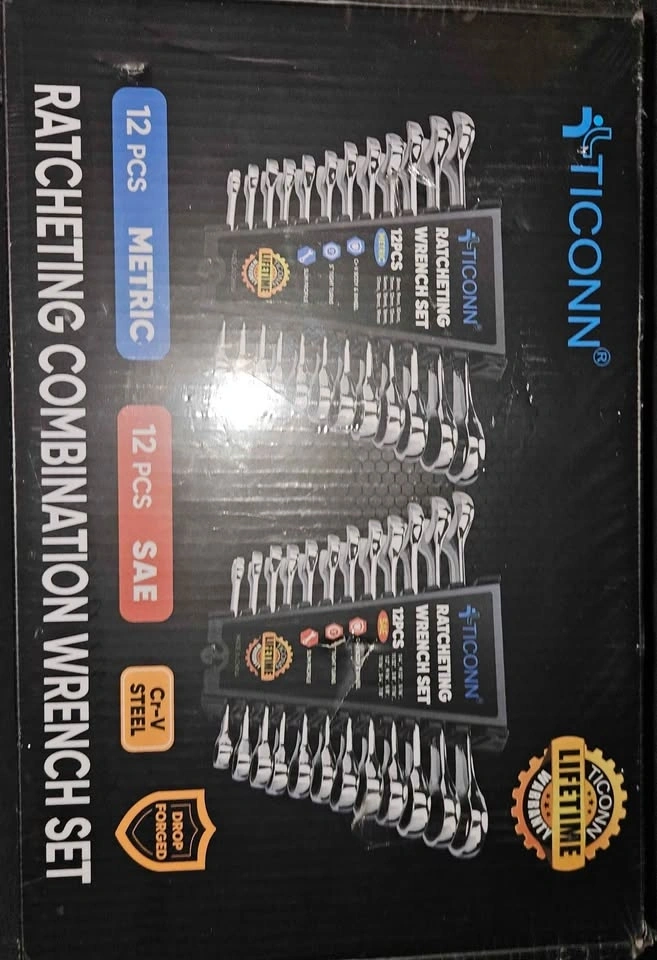 Brand new, factory sealed TICONN 24-piece Ratcheting Wrench Set with organizer rack. Perfect for mechanics, DIYers, car work, and home repairs. Includes 12 Metric (8mm–19mm) and 12 SAE (1/4"–7/8") wrenches. Features a slim profile for tight spaces and durable Chrome-Vanadium steel. Storage organizer rack included. A great complete starter or upgrade tool set.