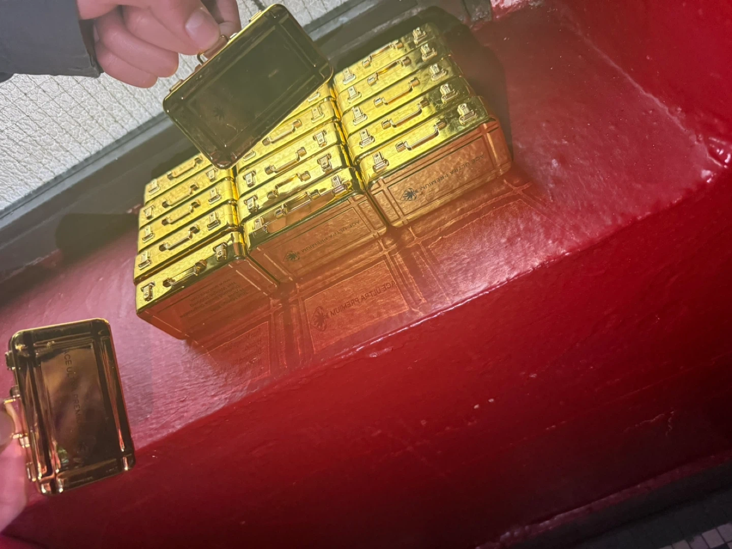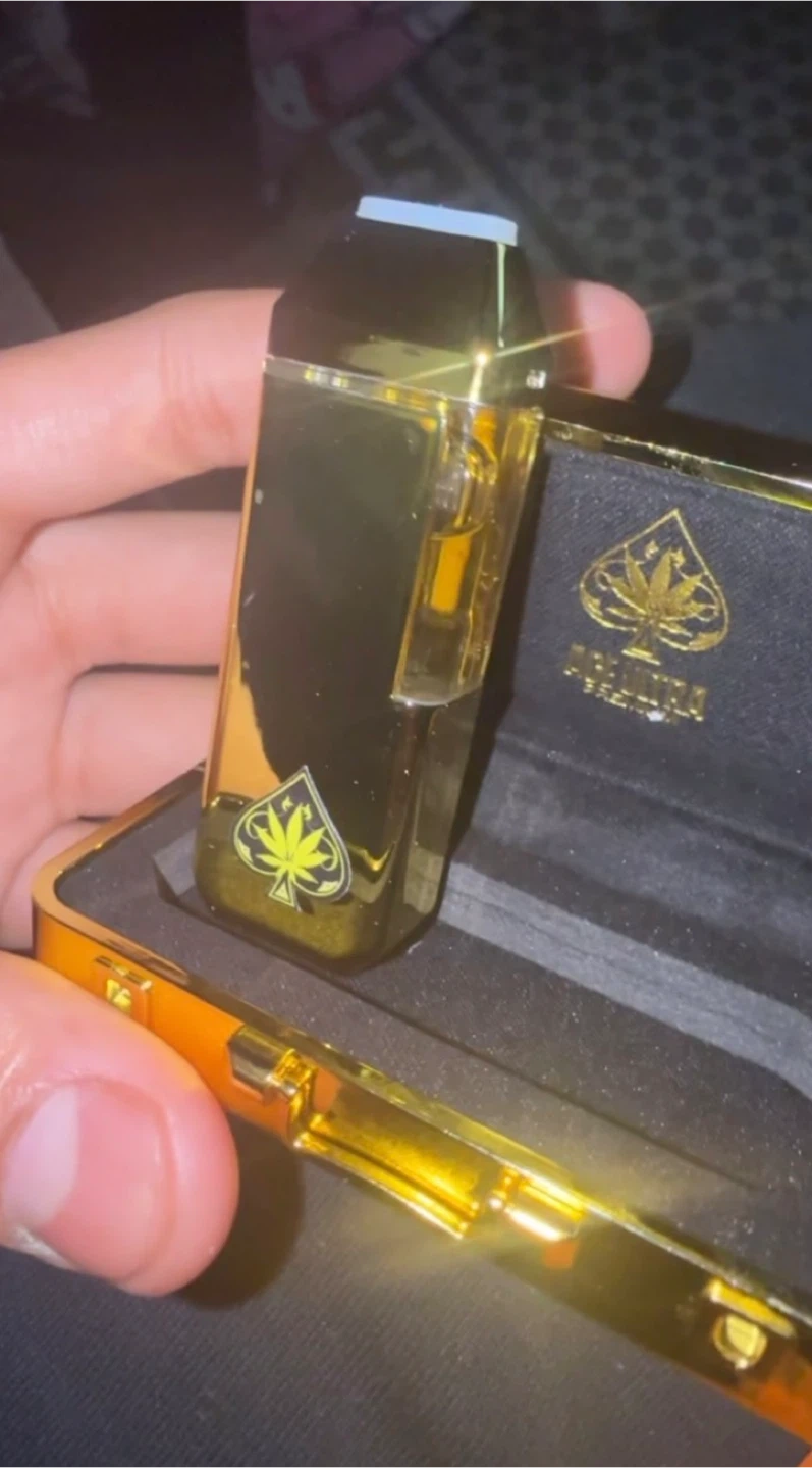 This is a golden vape pen case with an Ace of Spades design. It includes a vape pen The case is compact and comes with a velvet lining for protection.