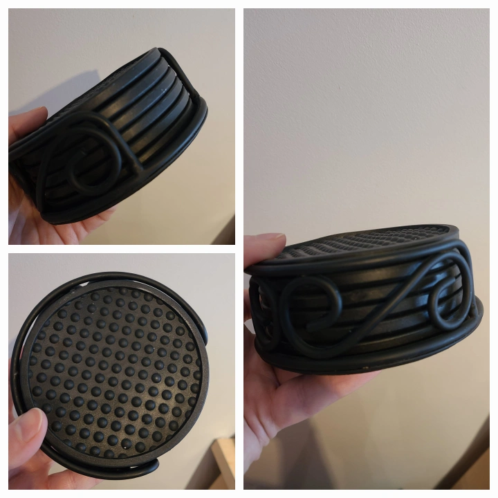 Black coasters with a decorative scrolled design on the sides. The top surface has a textured, dotted pattern for grip. Includes a matching holder to keep them tidy. Made from a flexible material.