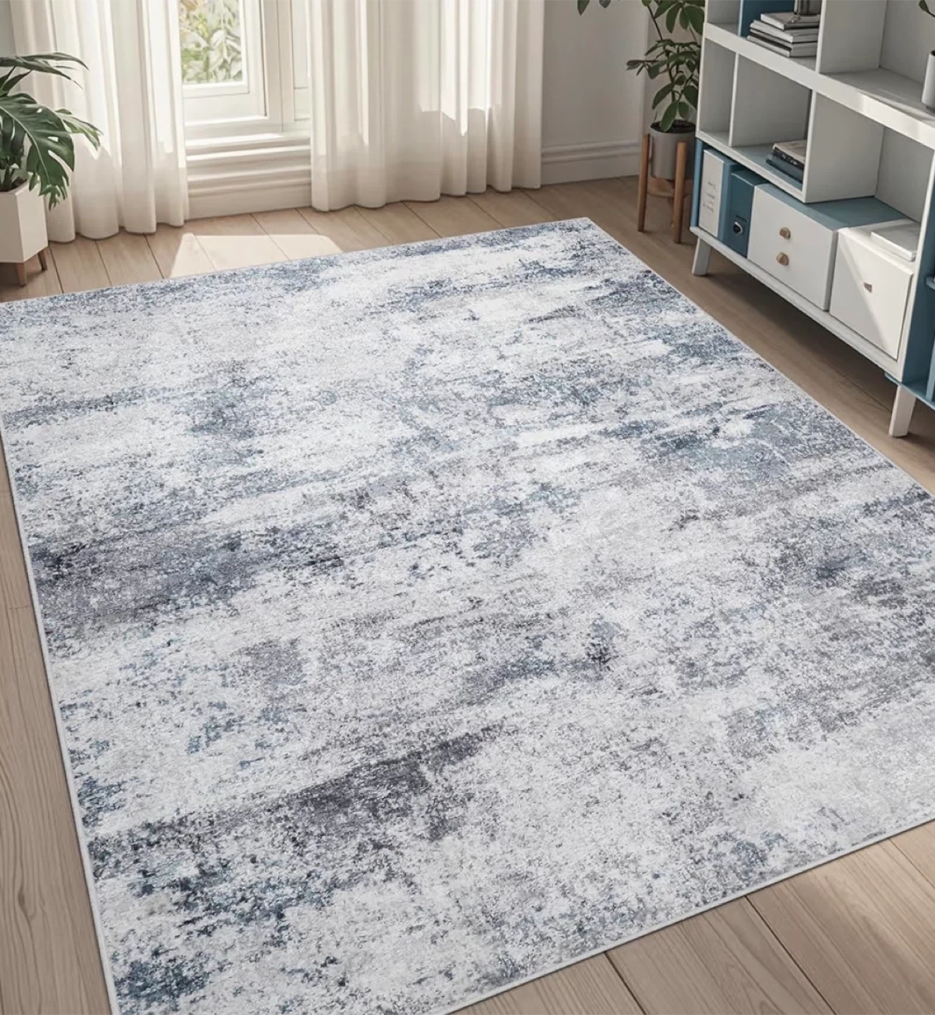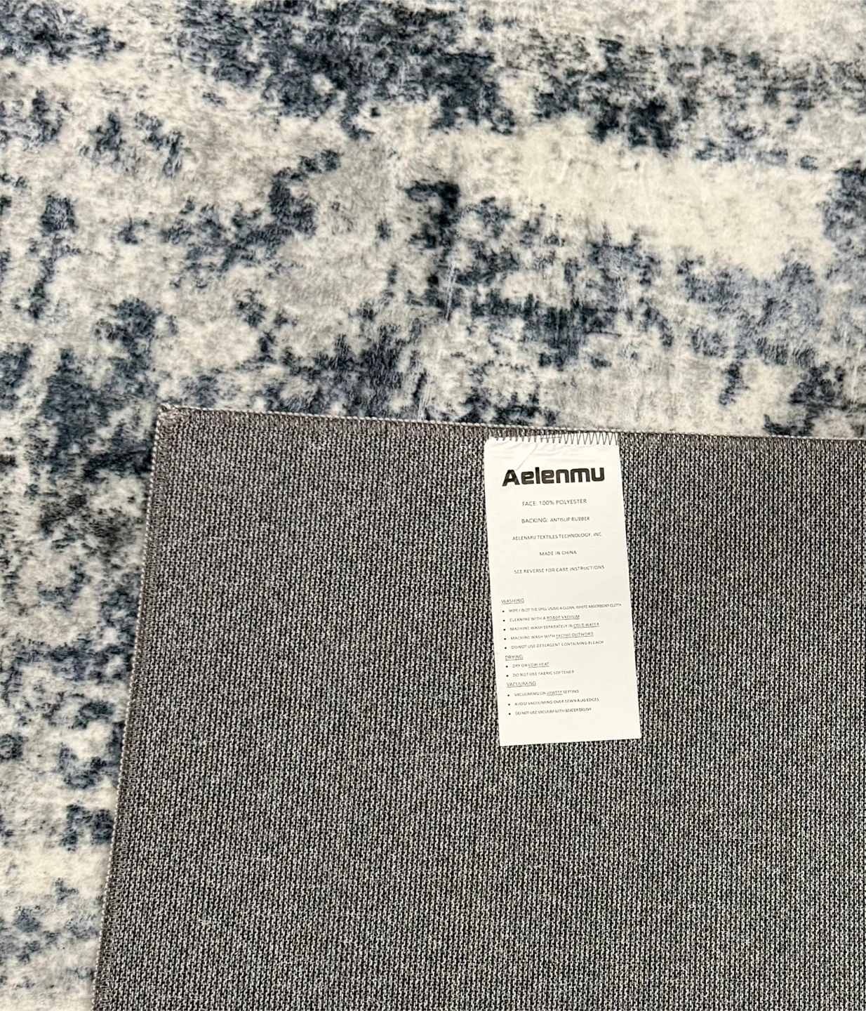 This Aelenmu area rug features a distressed abstract design in blue and white. It's made from 100% polyester with a non-slip backing. The rug is easily foldable and has a reinforced edge. This style adds a modern touch to any room! 5x8