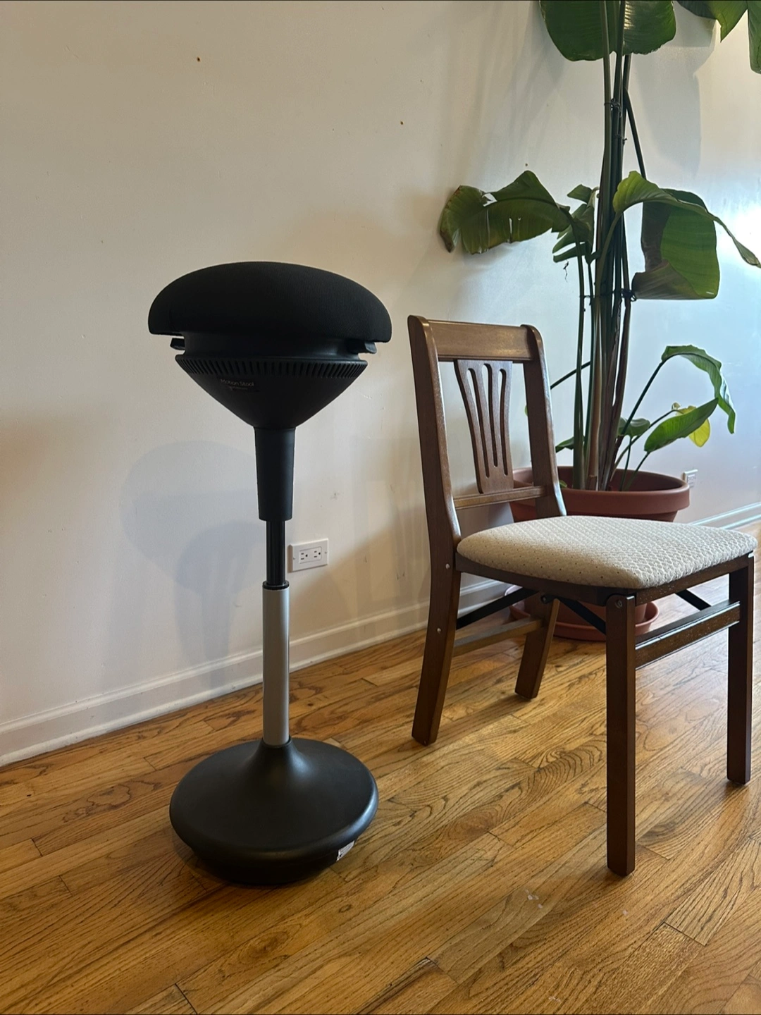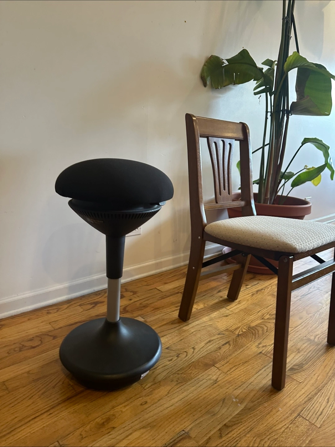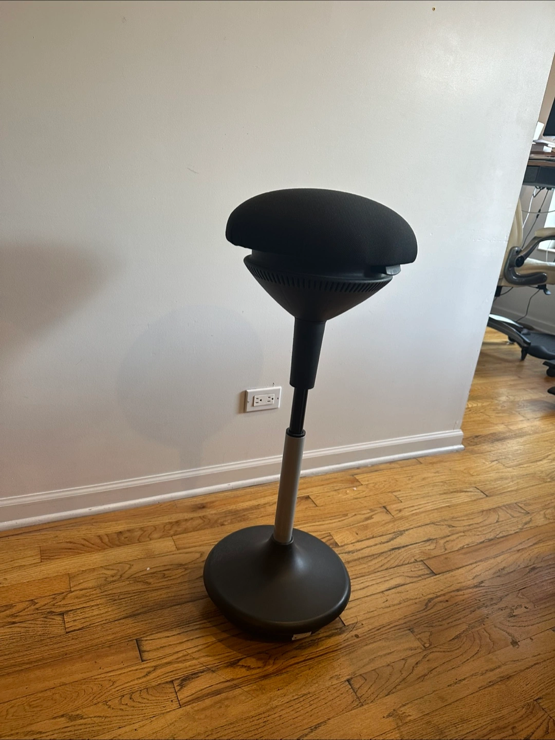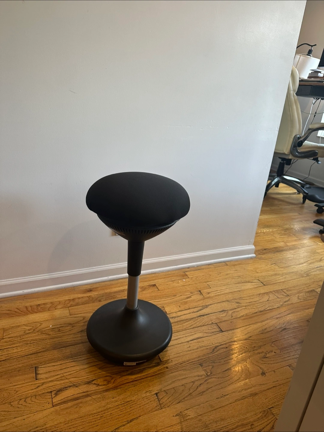 Selling a black wobble stool! Great for active sitting and improving your posture while working from home. It's in good condition and ready for a new home! Pictures show lowest and highest height, and it can be leveled to any being in between. Had dinner table chair in pictures for scale. Highest height: 34 inches Lowest height: 23 inches