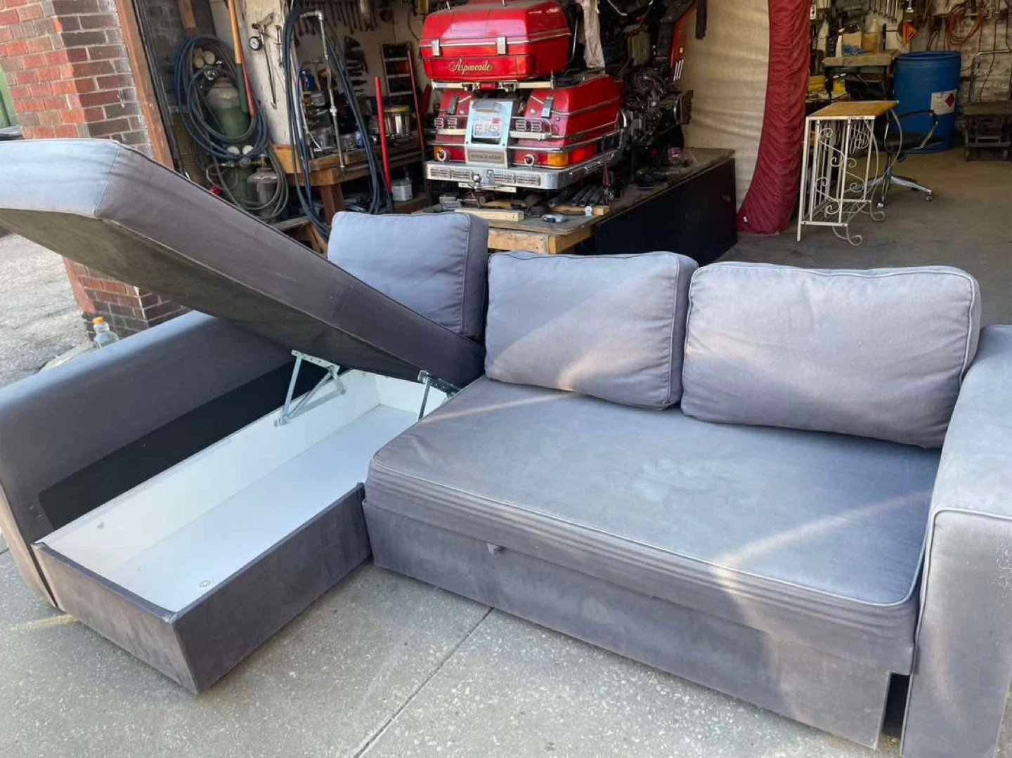 Gray fabric sectional sofa. Features a lift-top storage chaise for convenience. This couch offers ample seating and hidden storage space. Perfect for apartments or living rooms!
