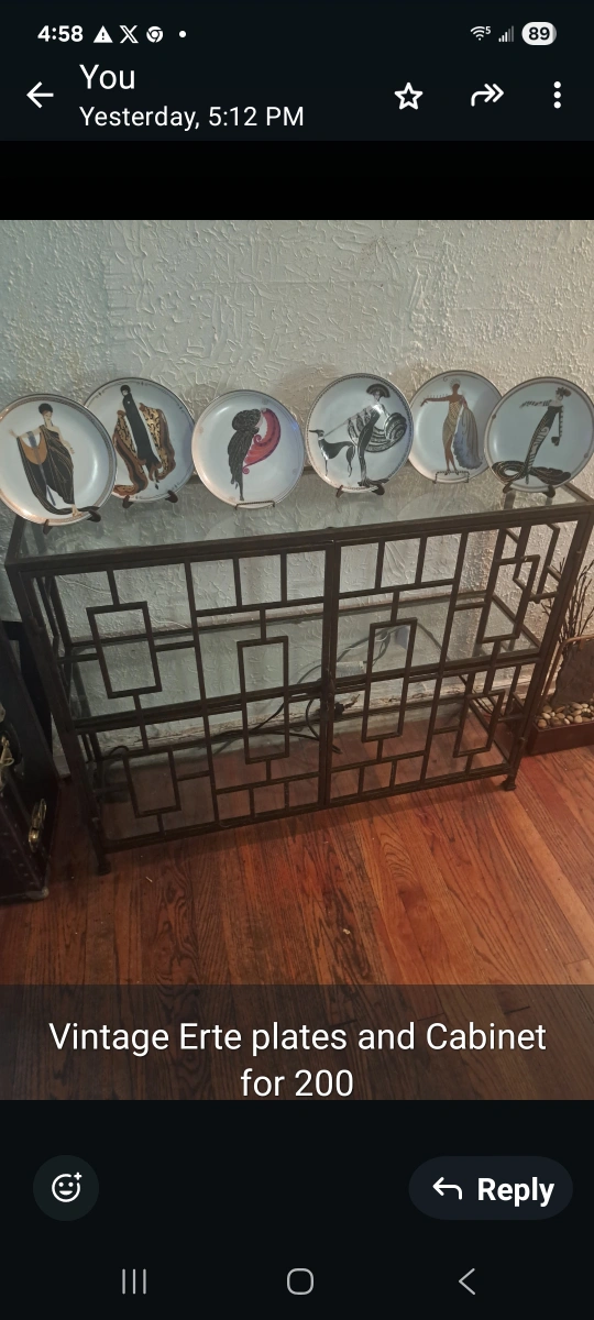 6 Vintage Erte plates, with glass/ wooden cabinet.