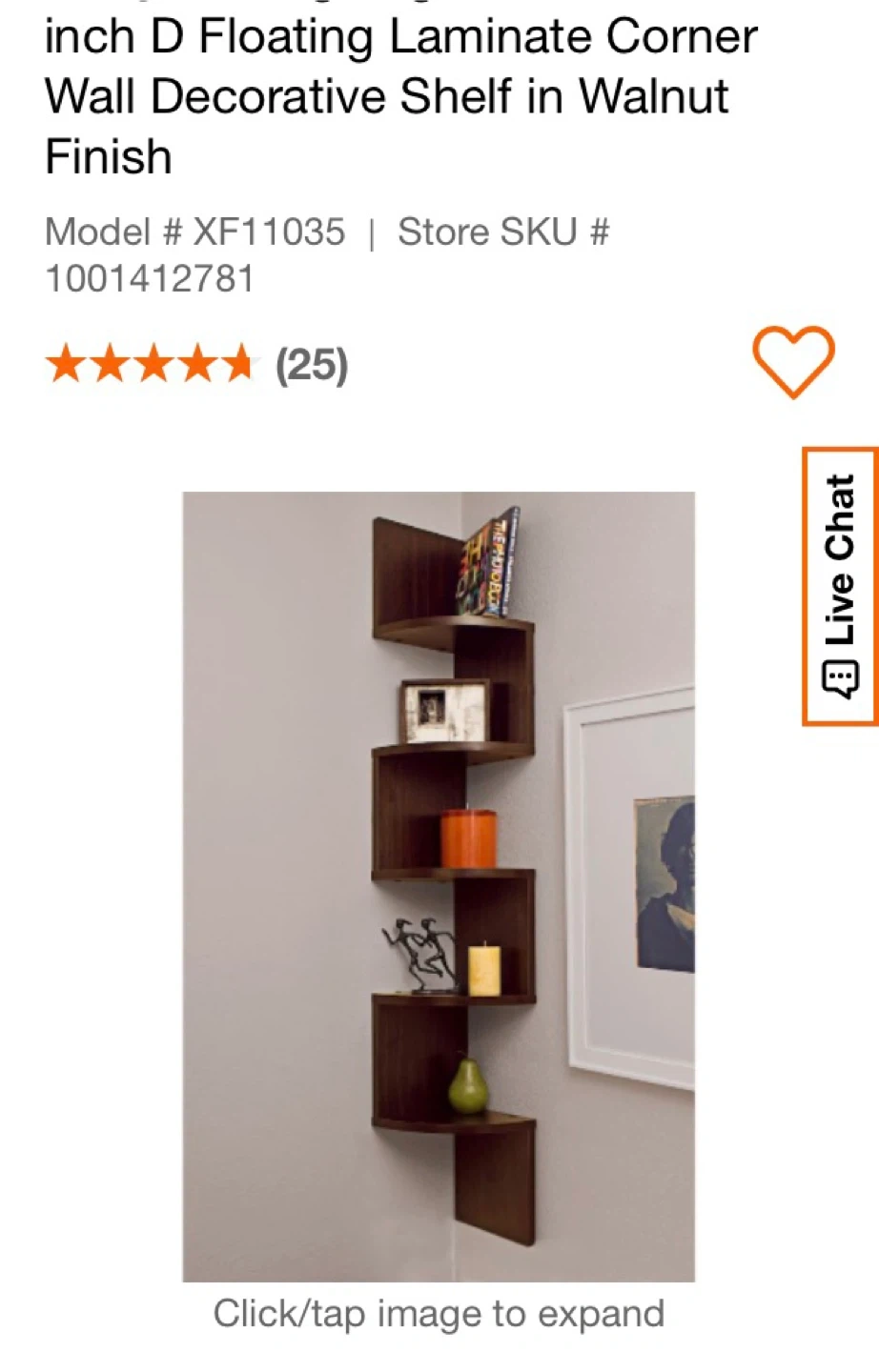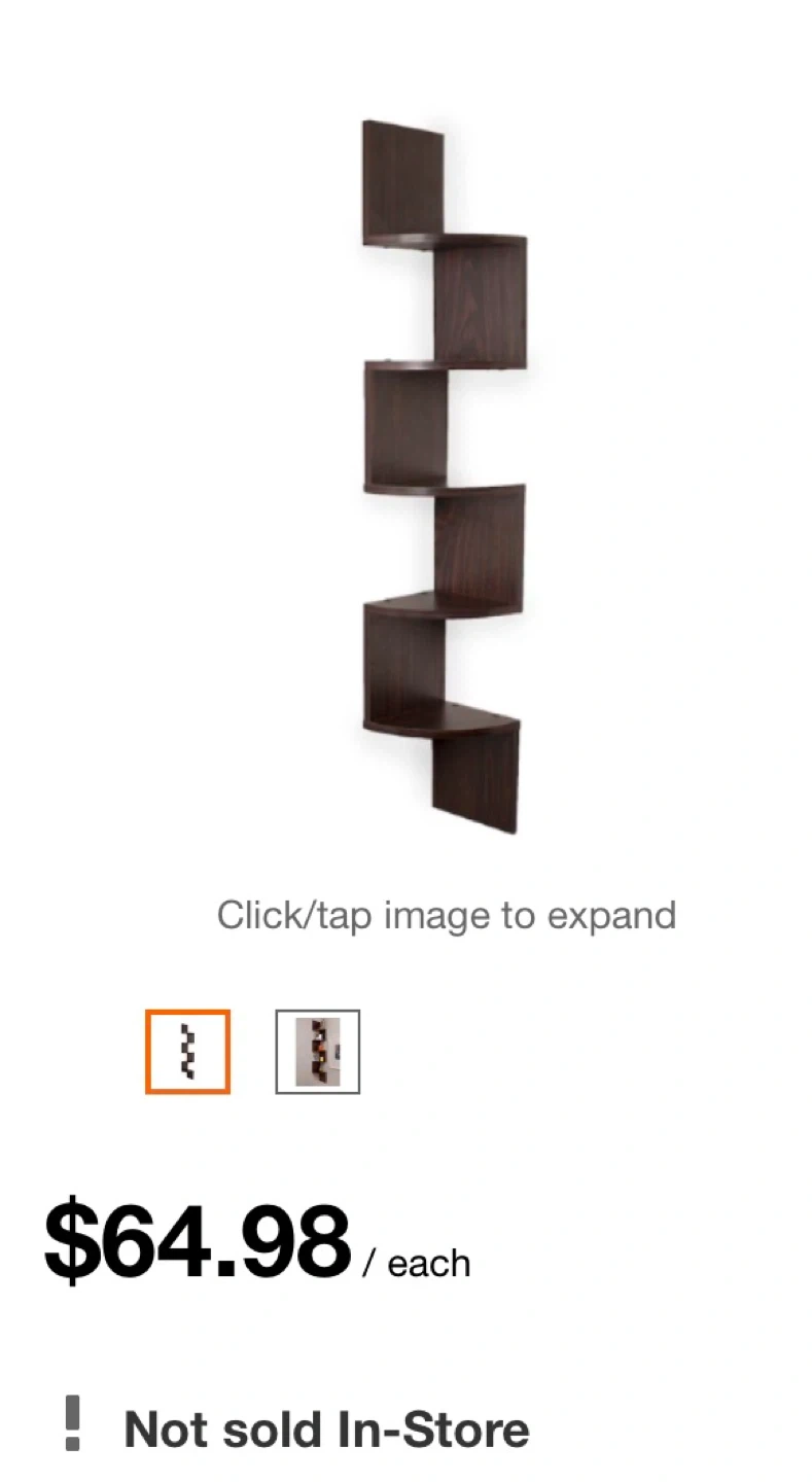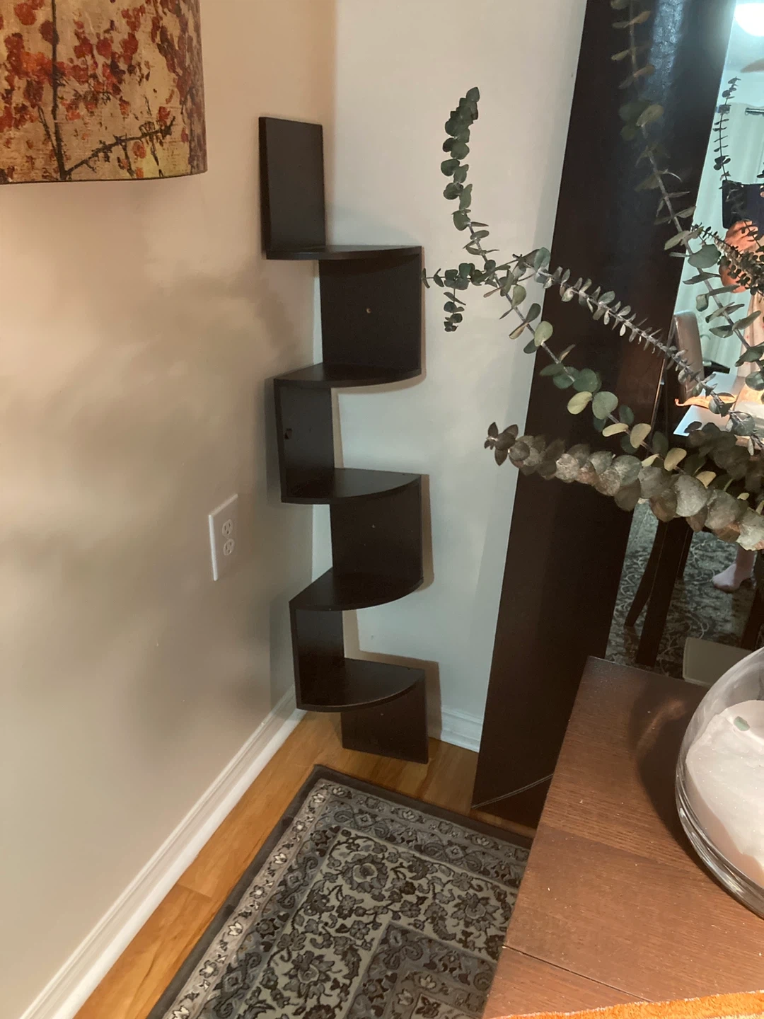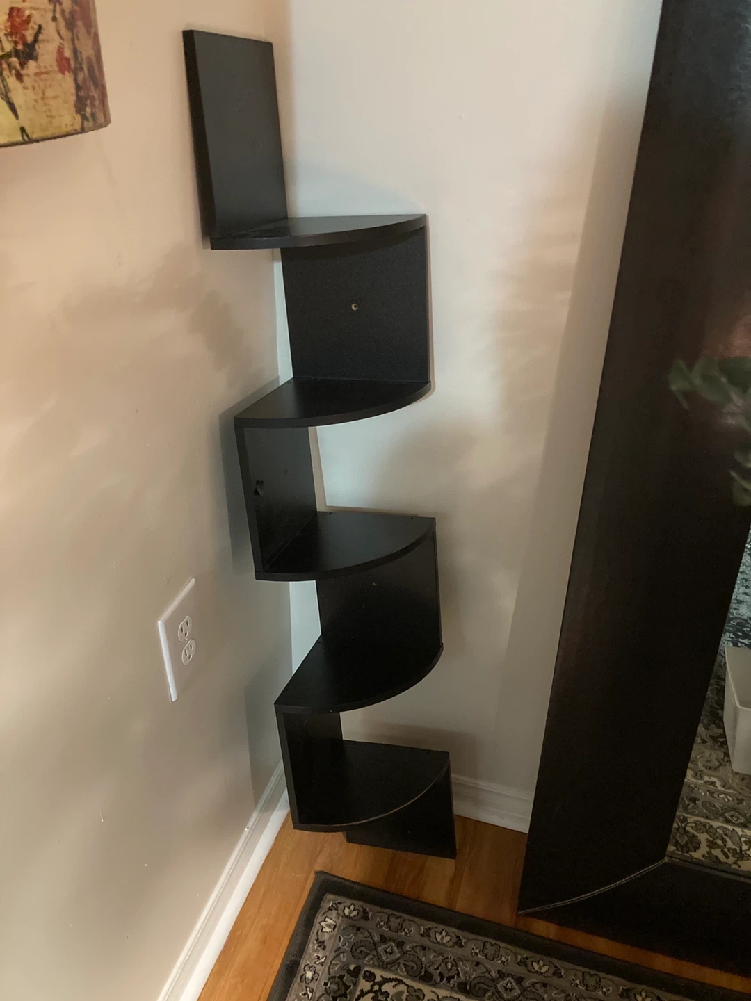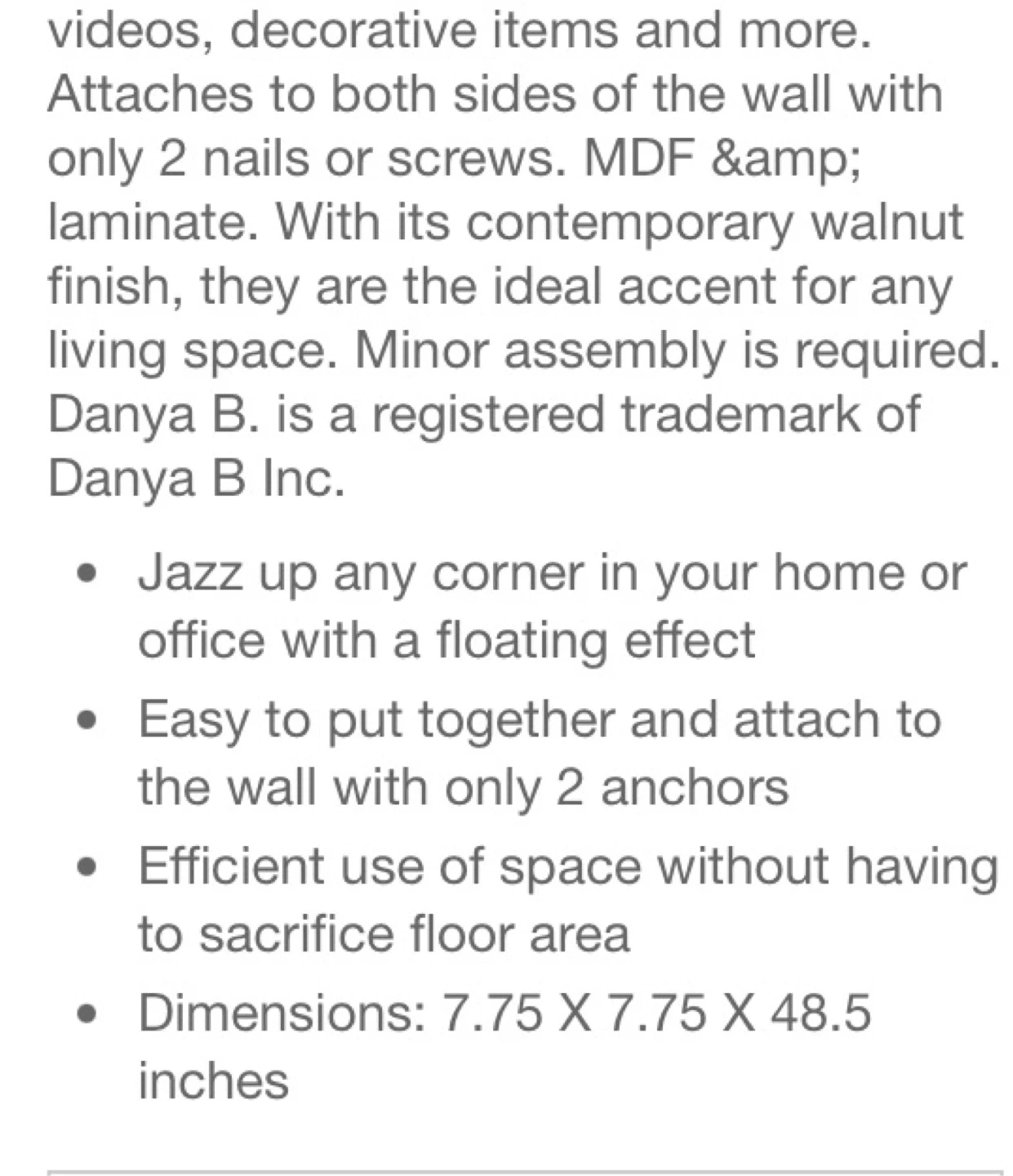 This is a black laminate floating corner wall shelf. It's made of MDF and laminate with a contemporary finish. Dimensions are 7.75 X 7.75 X 48.5 inches. It attaches to the wall with only 2 nails or screws.