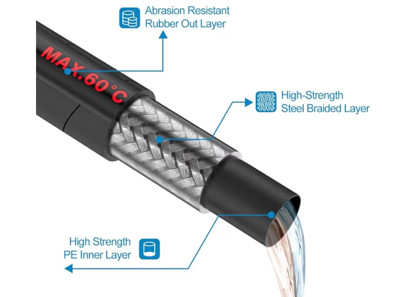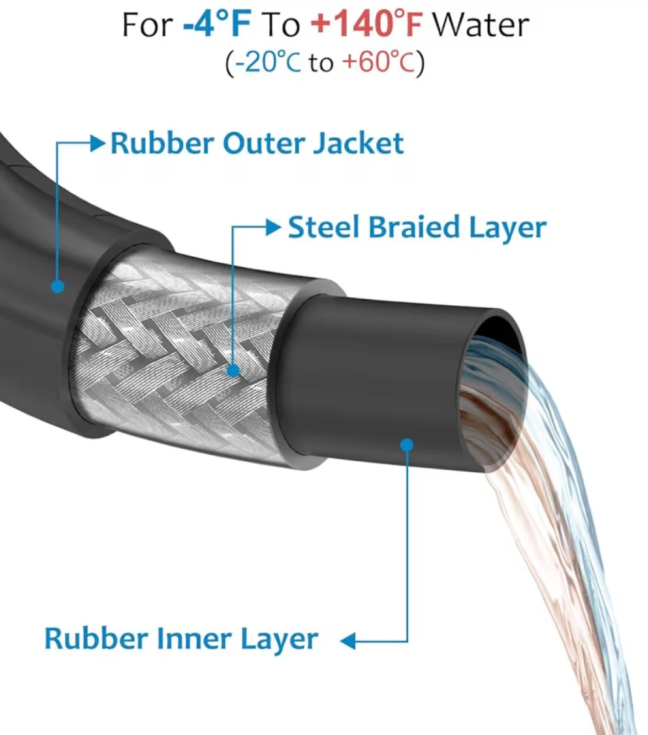 This is a 25-foot pressure washer hose with M22 14mm quick connectors. It's designed for high PSI commercial use and fits all-weather conditions, from -4°F to +140°F. The hose features a rubber outer jacket, steel braided layer, and a rubber inner layer for durability and kink resistance.