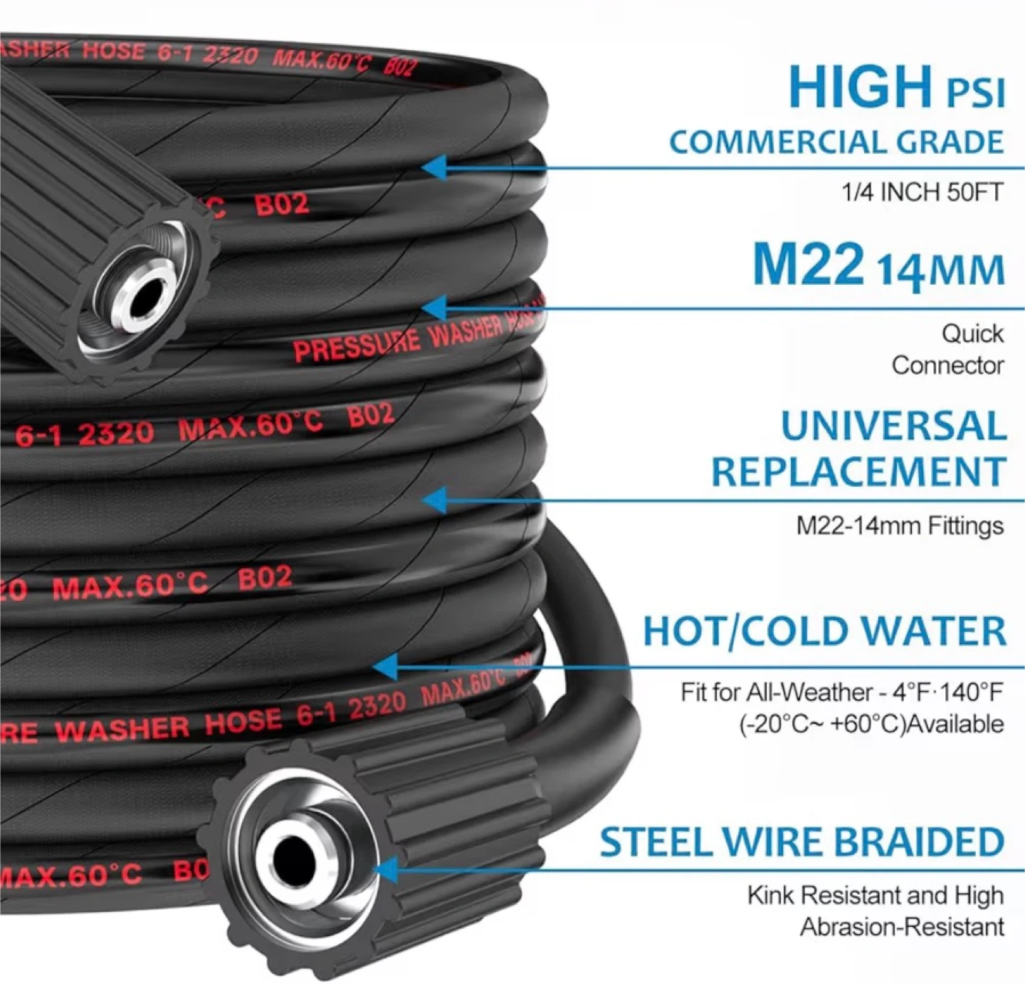 25ft Pressure Washer Hose M22 14mm Quick Connector