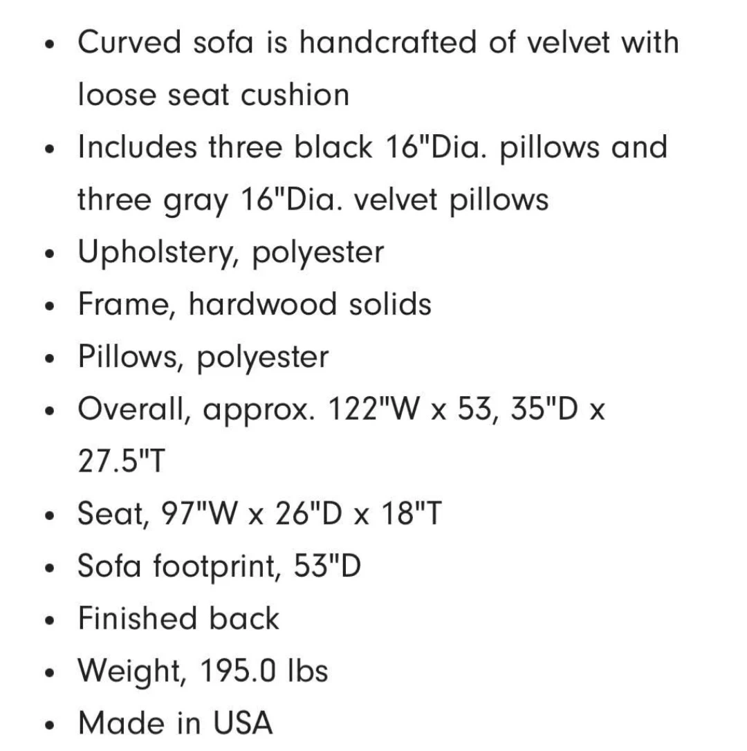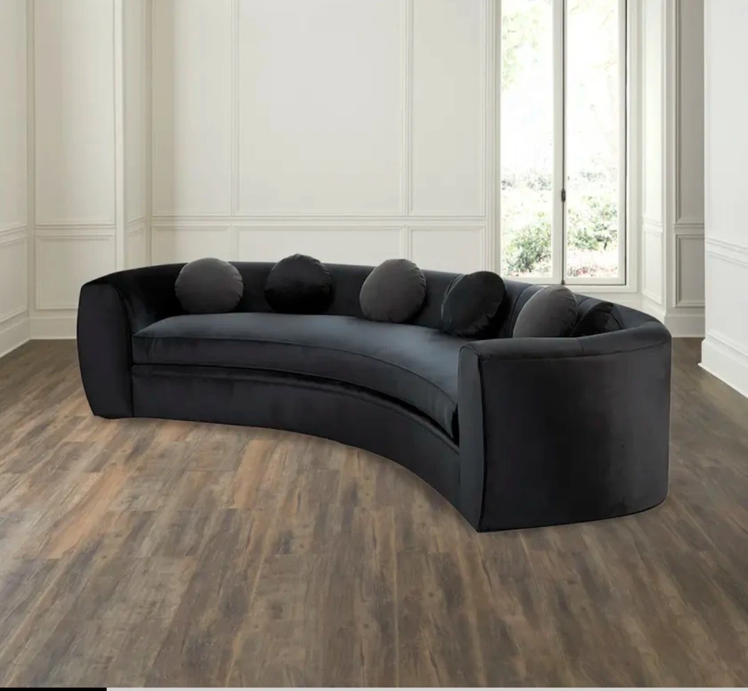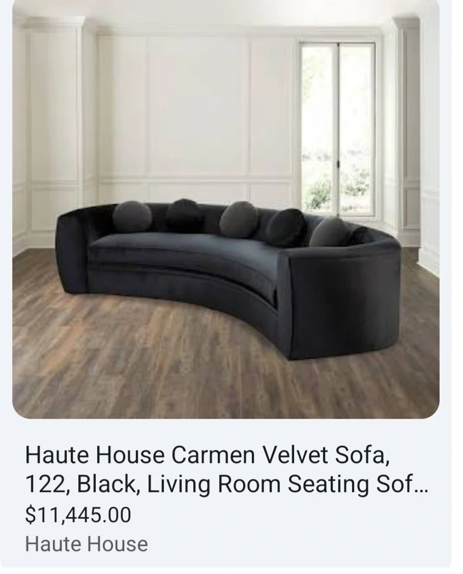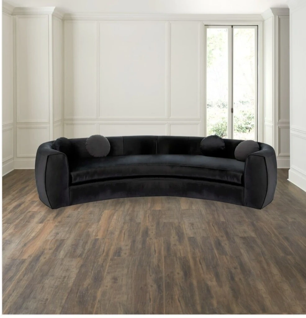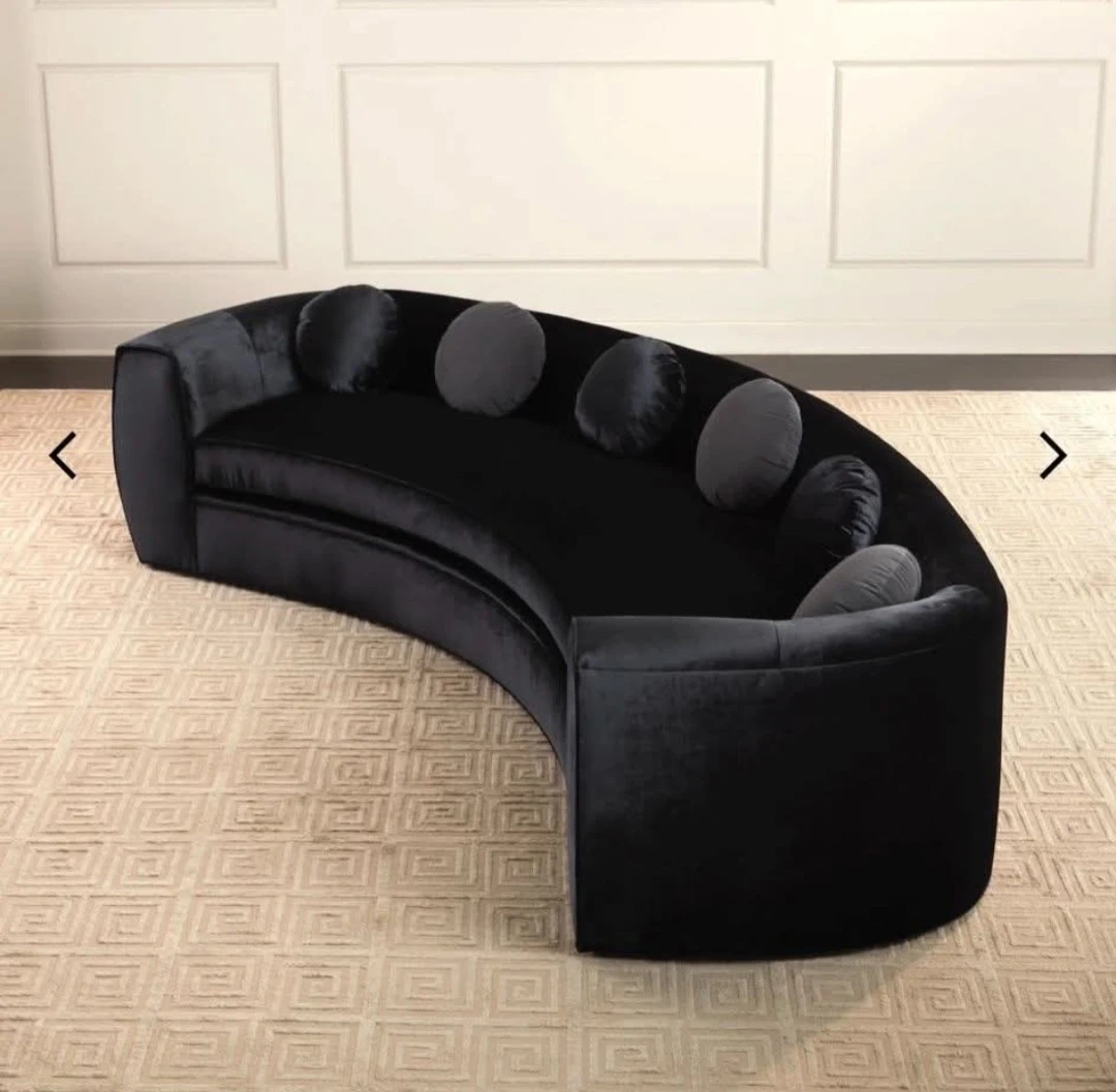 Used beautiful large Haute House brand from Neiman marcus black velvet sofa. Beautiful crescent shape one of a kind design.