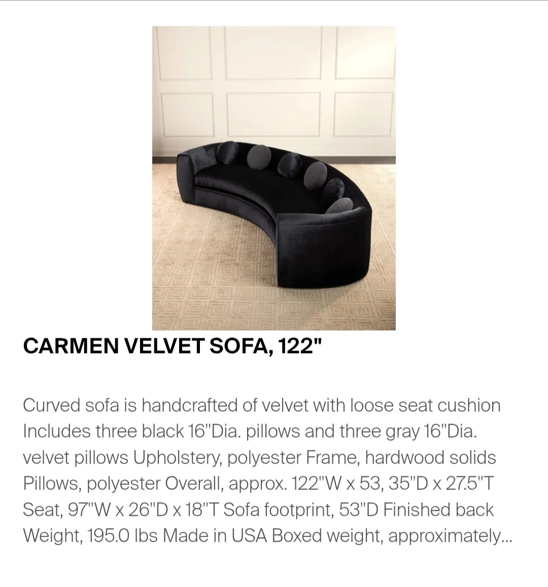 Very large 122 inches long.,53 inches wide .this is made with quality handcrafted Artisans with every detail and quality material and top quality velvet.This brand furniture is made in the usa hollywood California, not mass produced like those cheaply made China furniture. its very expensive selling for $11,000!!