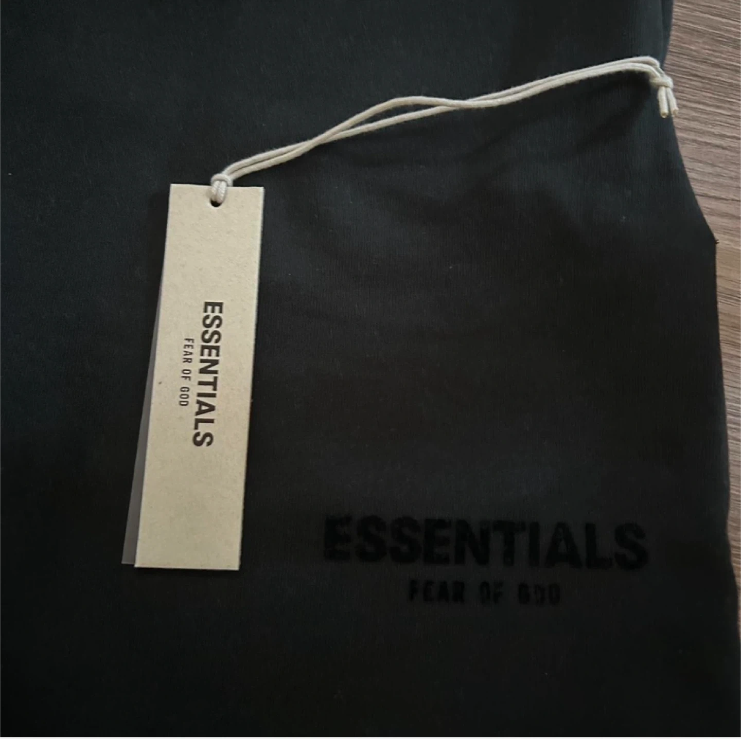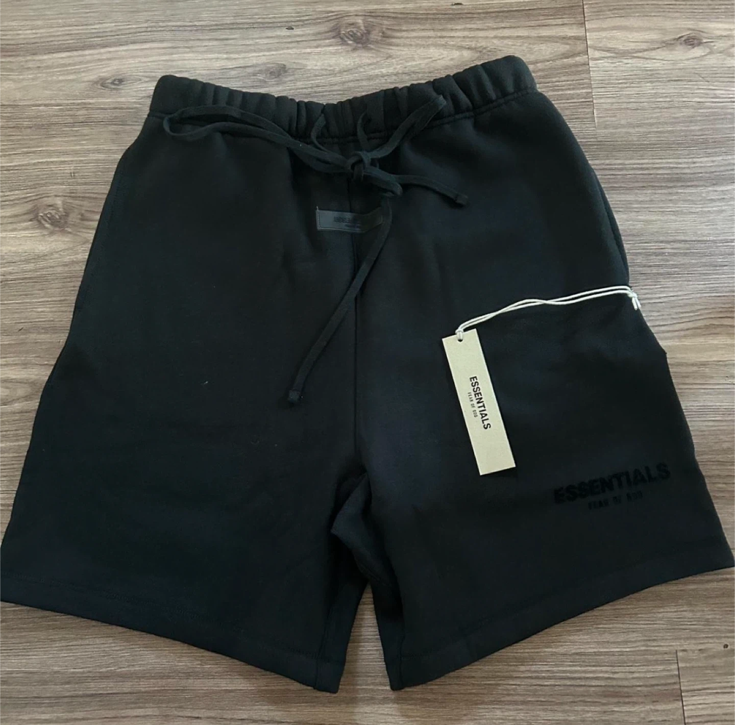 These are a pair of black sweat shorts from Essentials. They feature a drawstring waist and the Essentials logo on the leg. Great for lounging or working out!