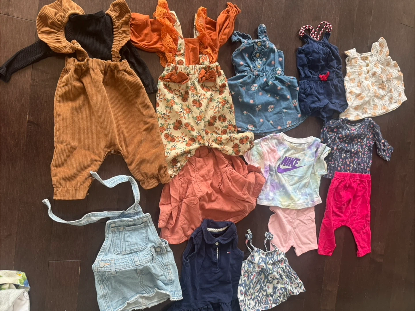 This bundle includes a variety of baby girl outfits. You'll find overalls, dresses, shorts, and tops in different fabrics and patterns. All items appear to be in good condition.