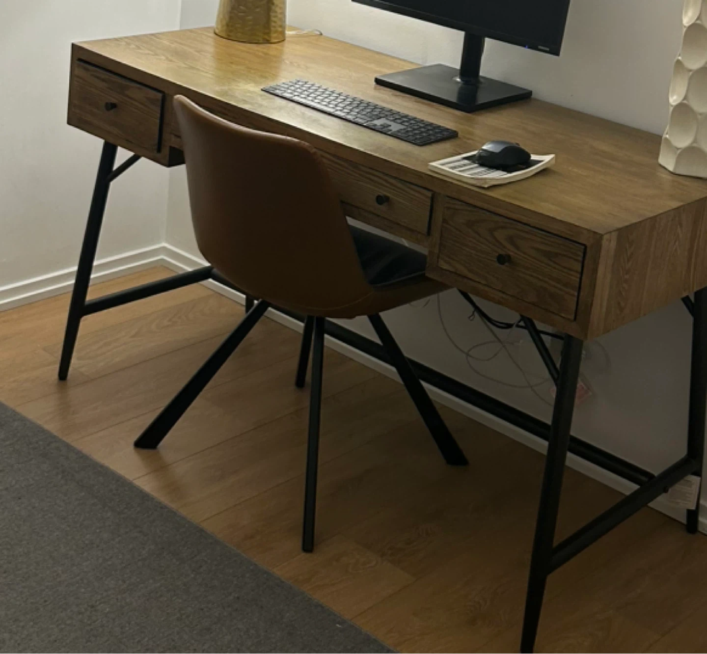 Brown desk with three drawers and black metal legs. It's perfect for a home office setup. The desk offers ample surface space and storage for your essentials.