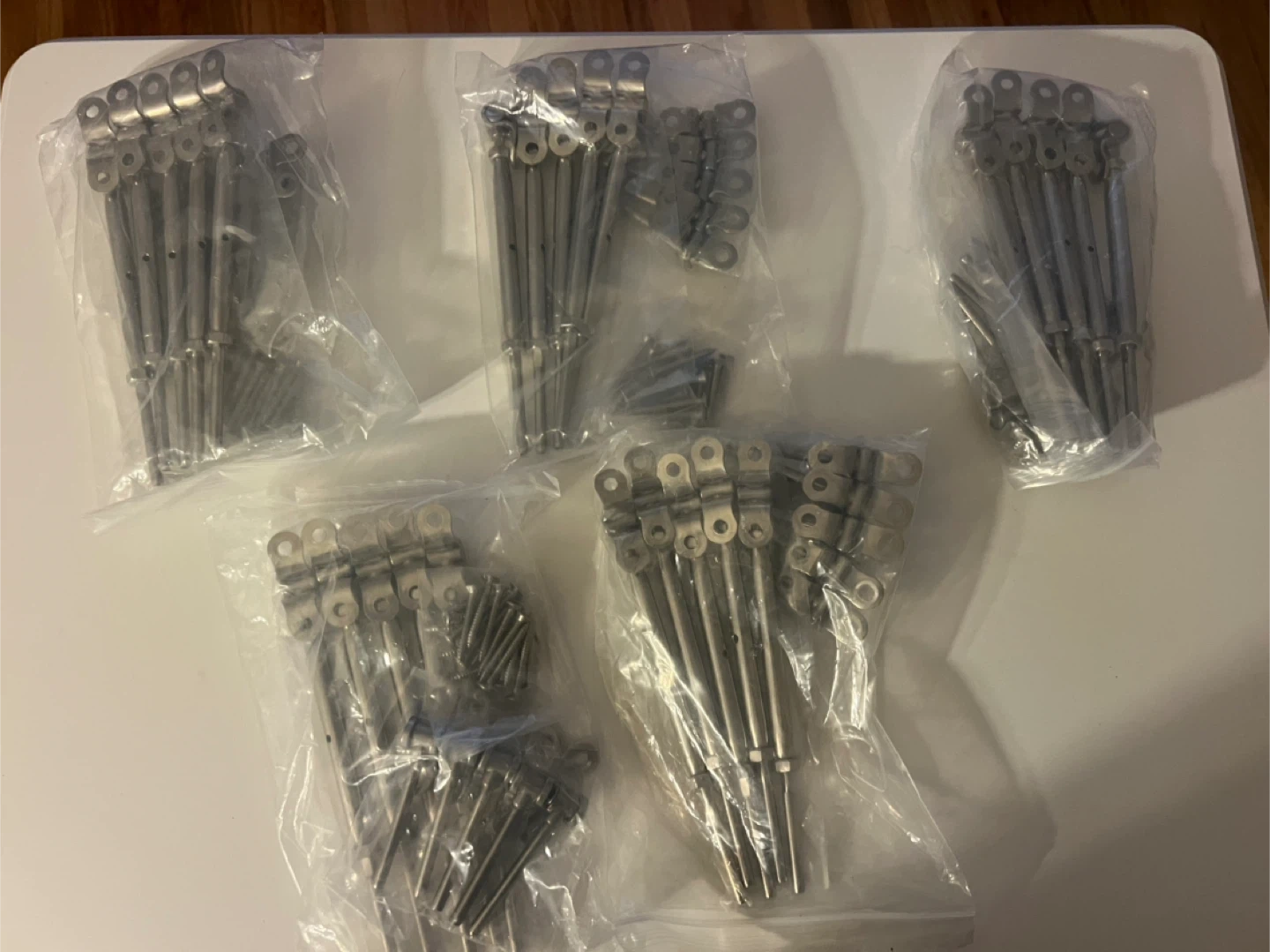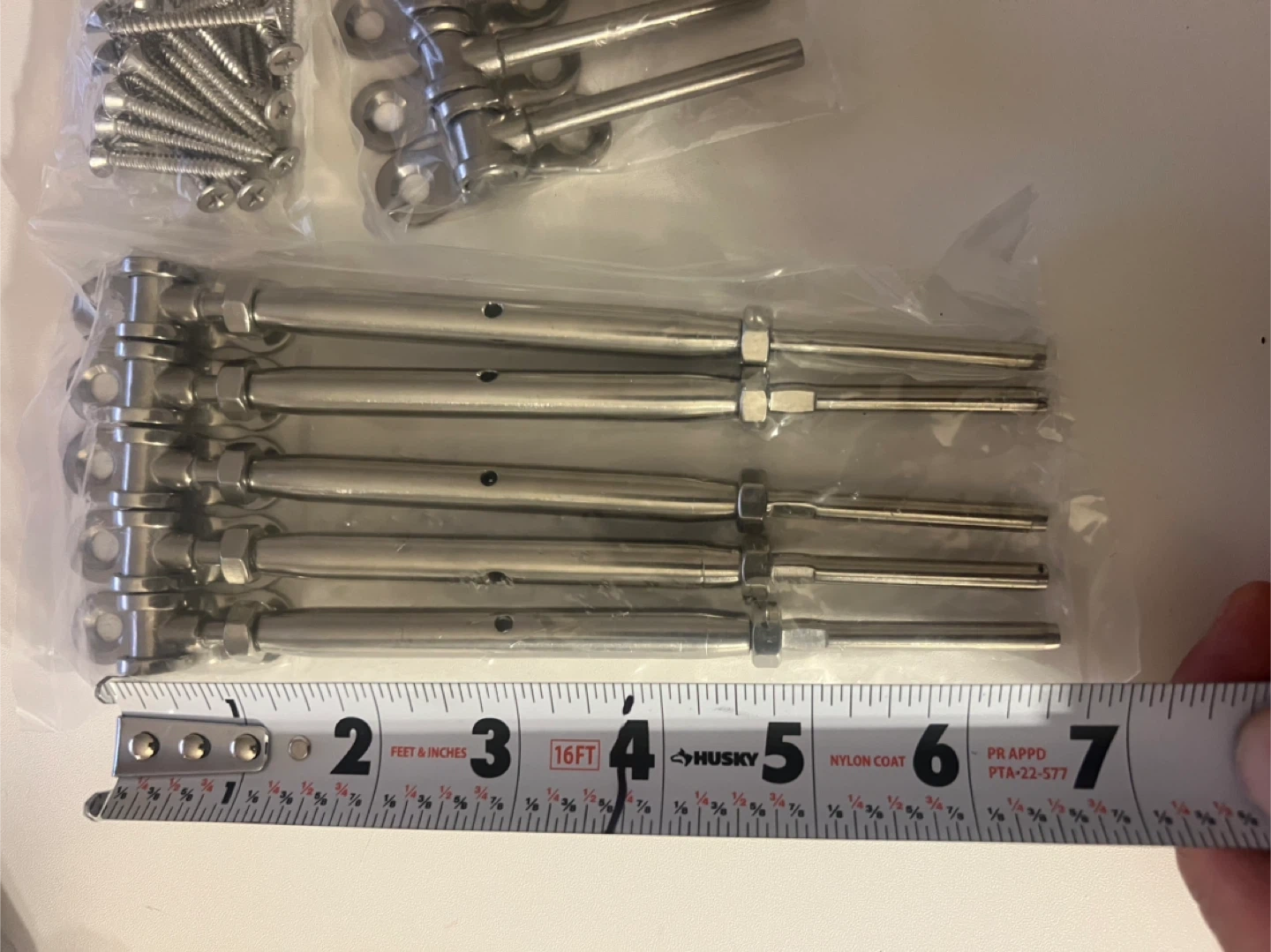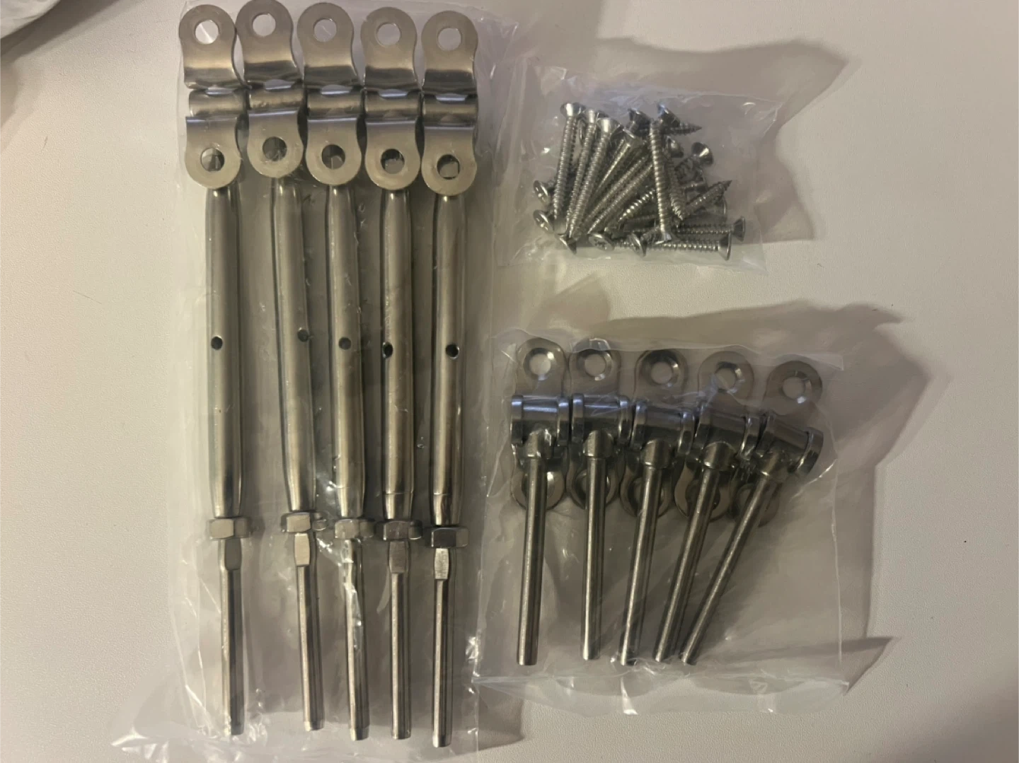 Set of new cable railing kits. Each kit includes turnbuckles and eye screws. Made of stainless steel. Approximately 1/8" cable size. 50 piece set.