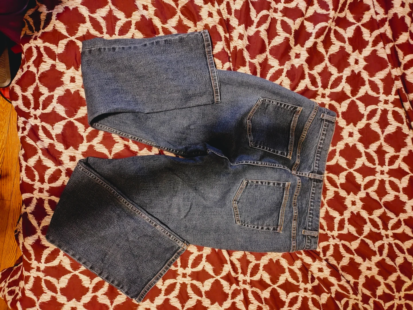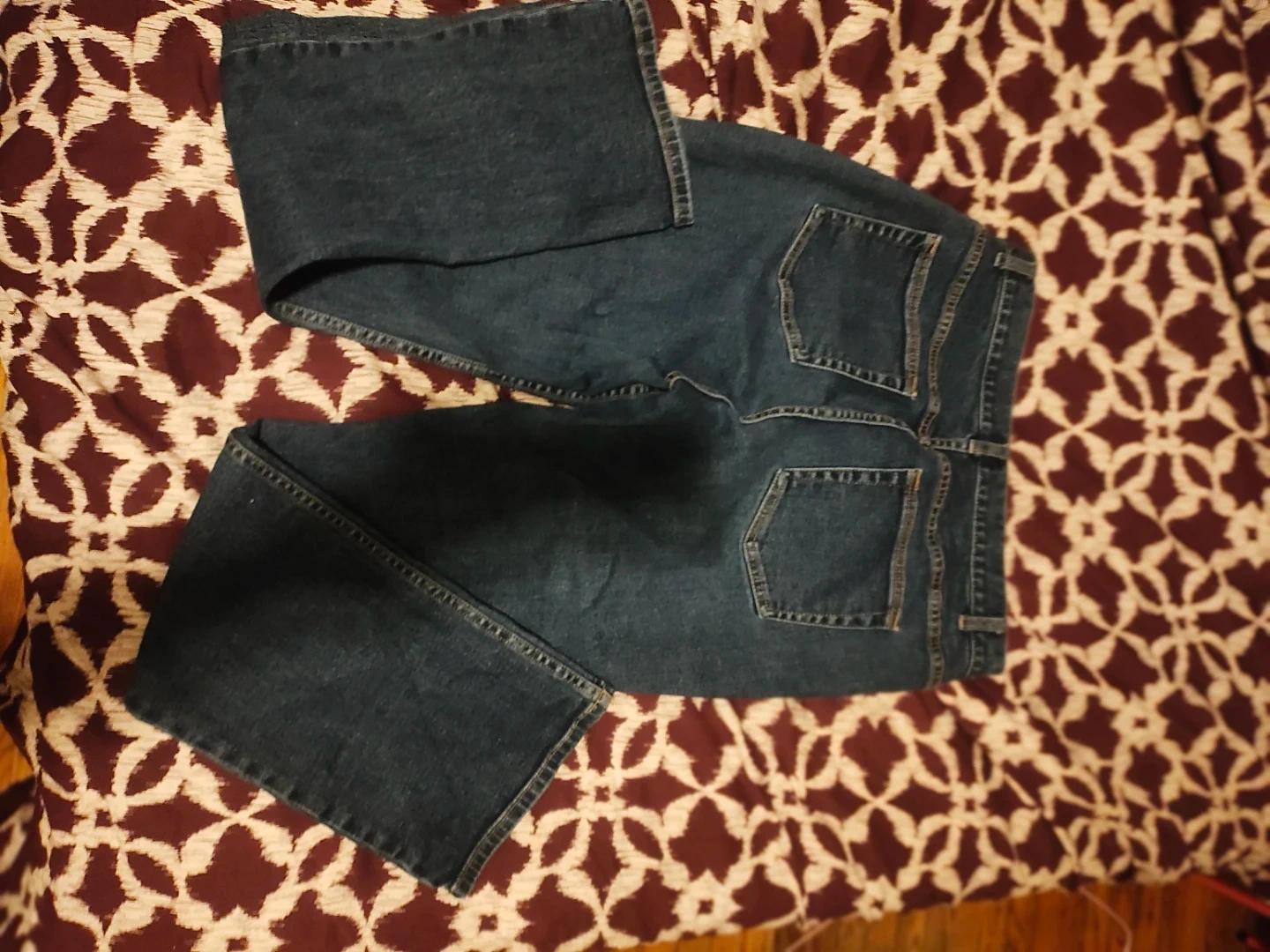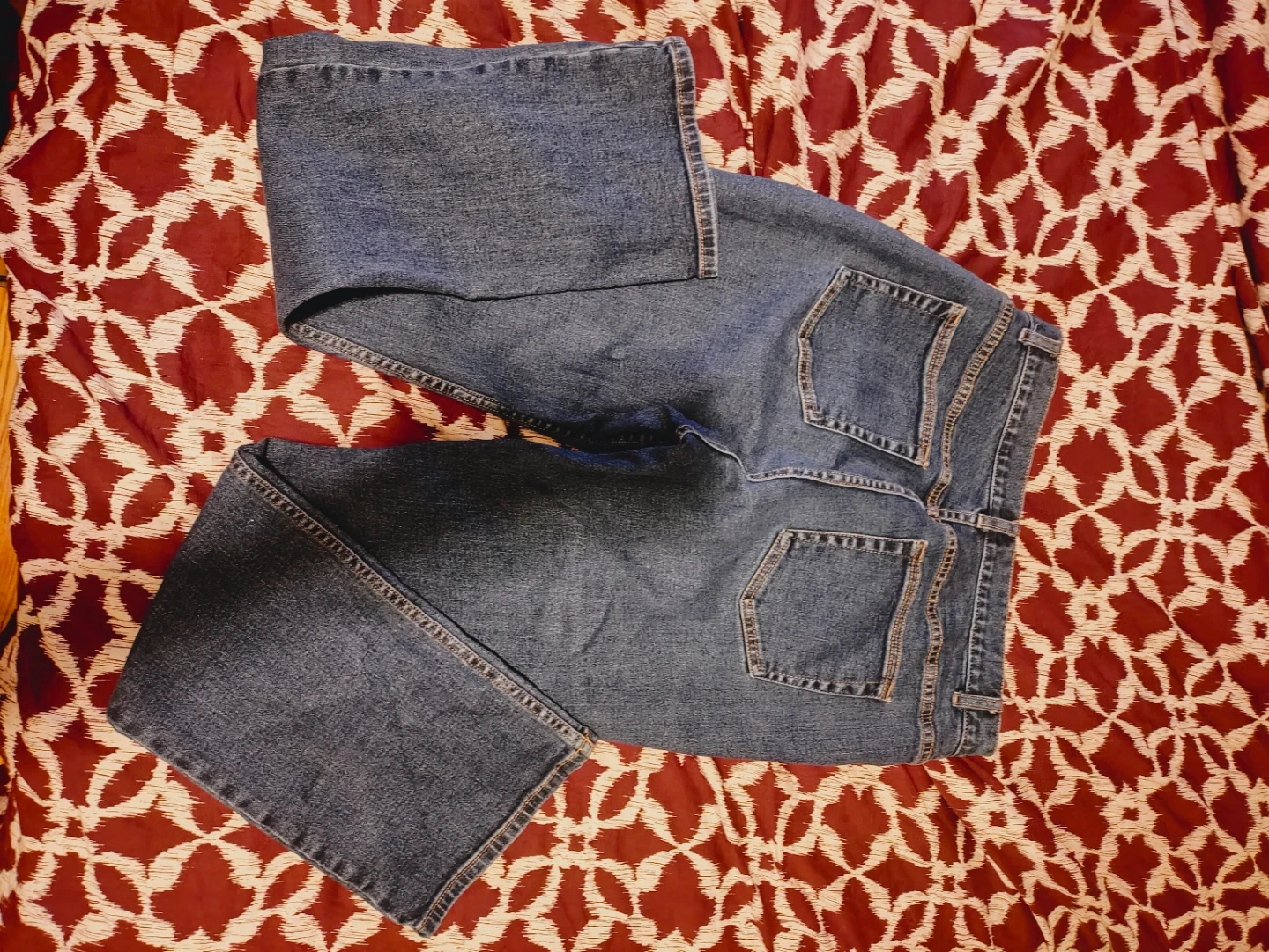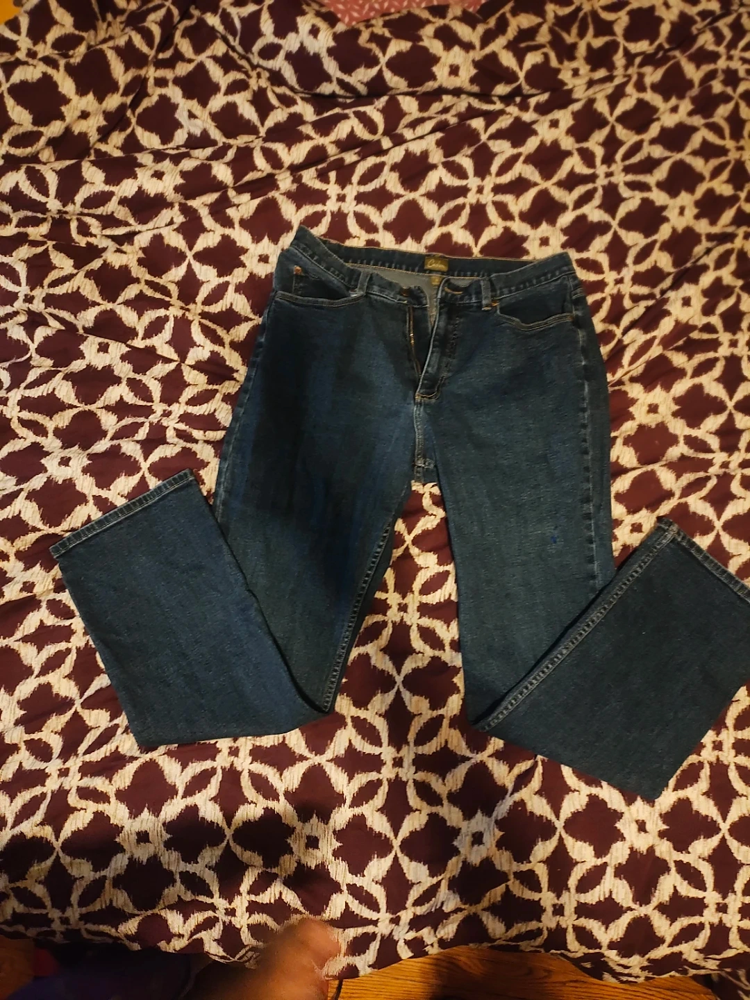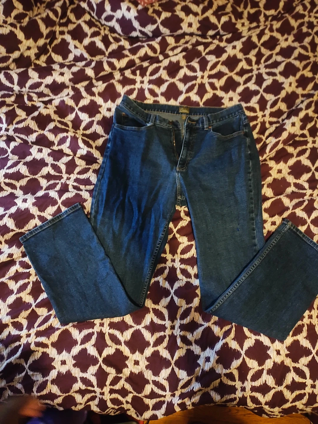 Classic blue denim bootcut jeans from Lee size 14. Listed as used but never worn. Features a button and zip fly closure with belt loops. These jeans are made of comfortable denim material.