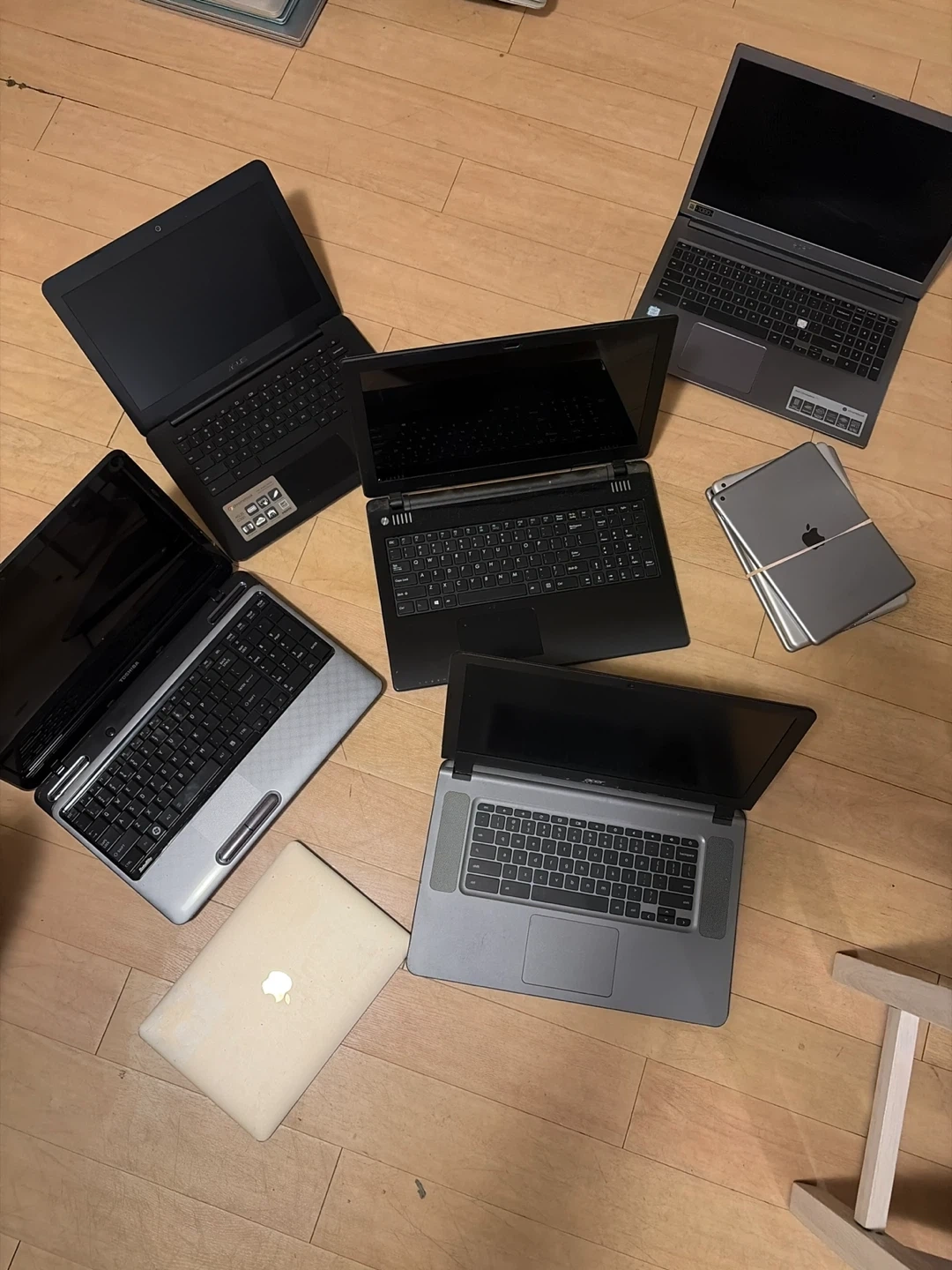 Includes an Apple iPad, a Toshiba laptop, and three other assorted laptops. Various brands and models are present in this lot.