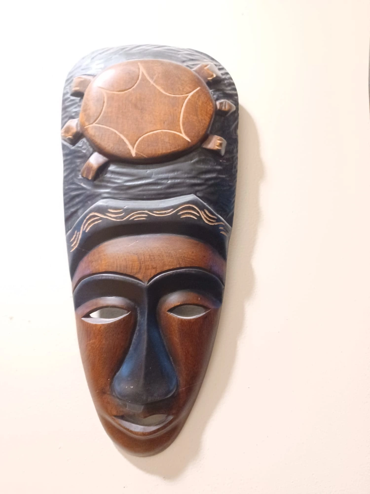 Intricate wooden mask. Features a carved cream color turtle on top. Dark brown and black tones. Wall hanging. Unique decor.