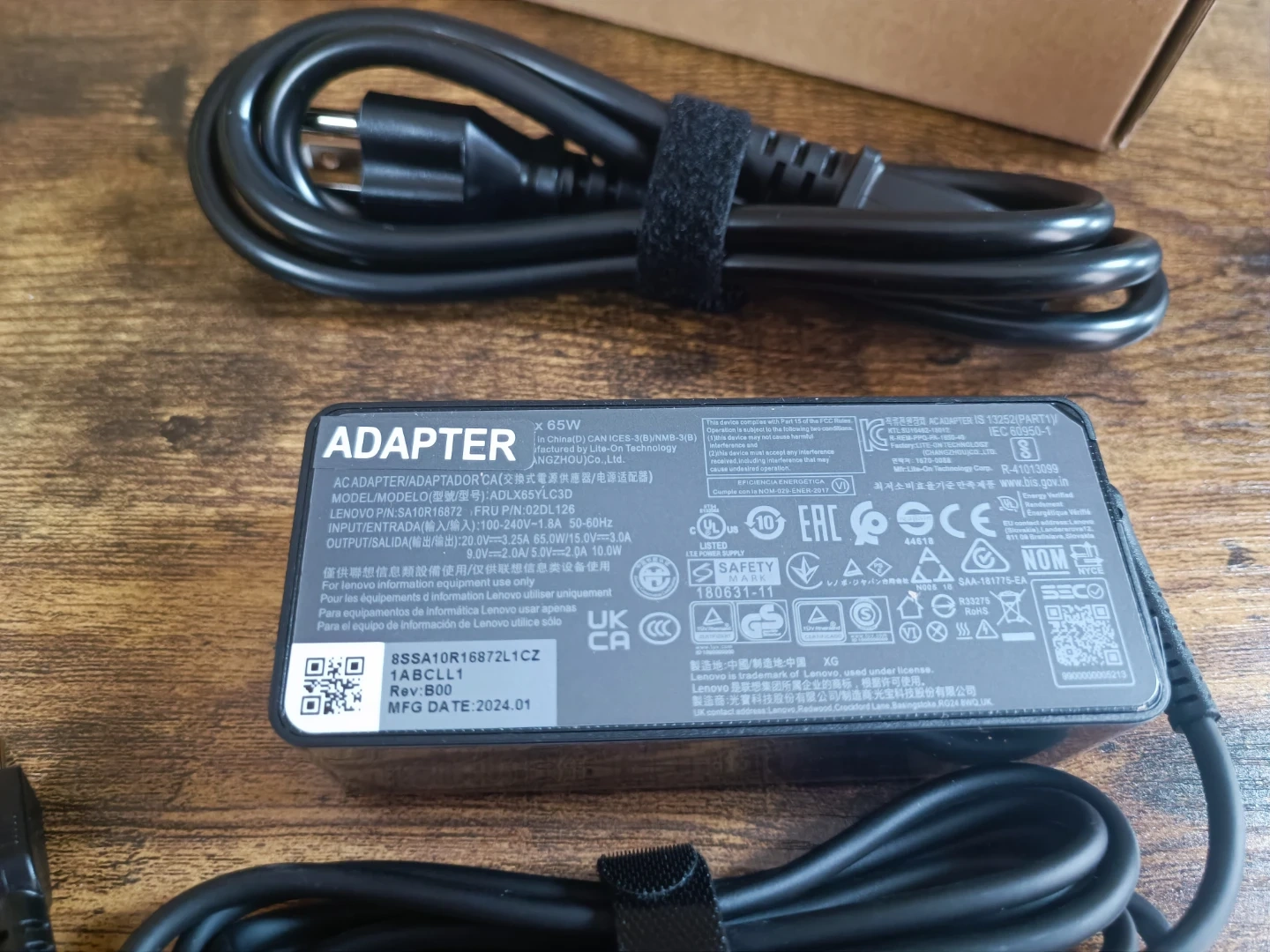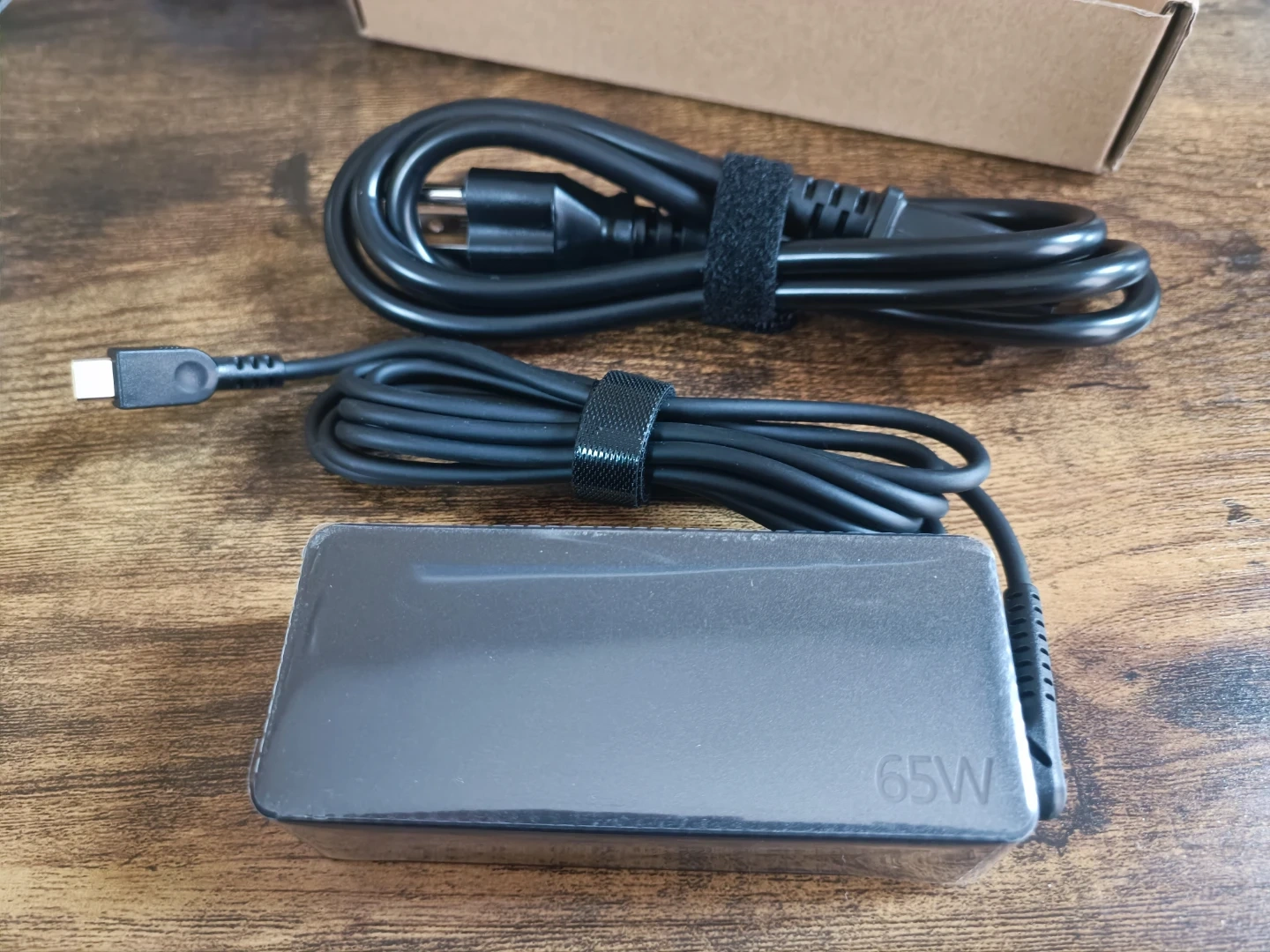 This is a Lenovo 65W USB-C power adapter. It's a replacement or spare charger for compatible laptops. The adapter comes with its AC power cord and a USB-C cable.