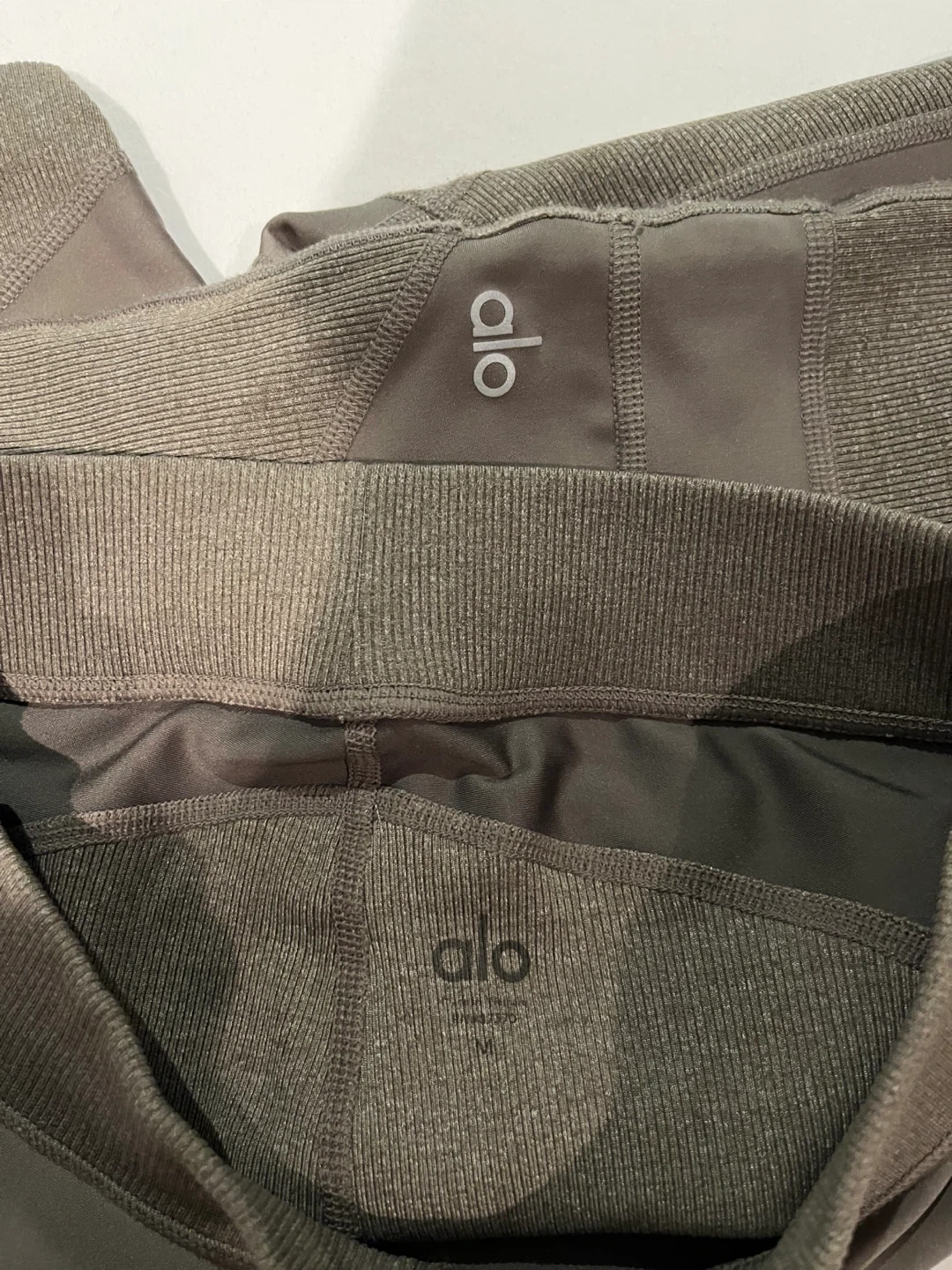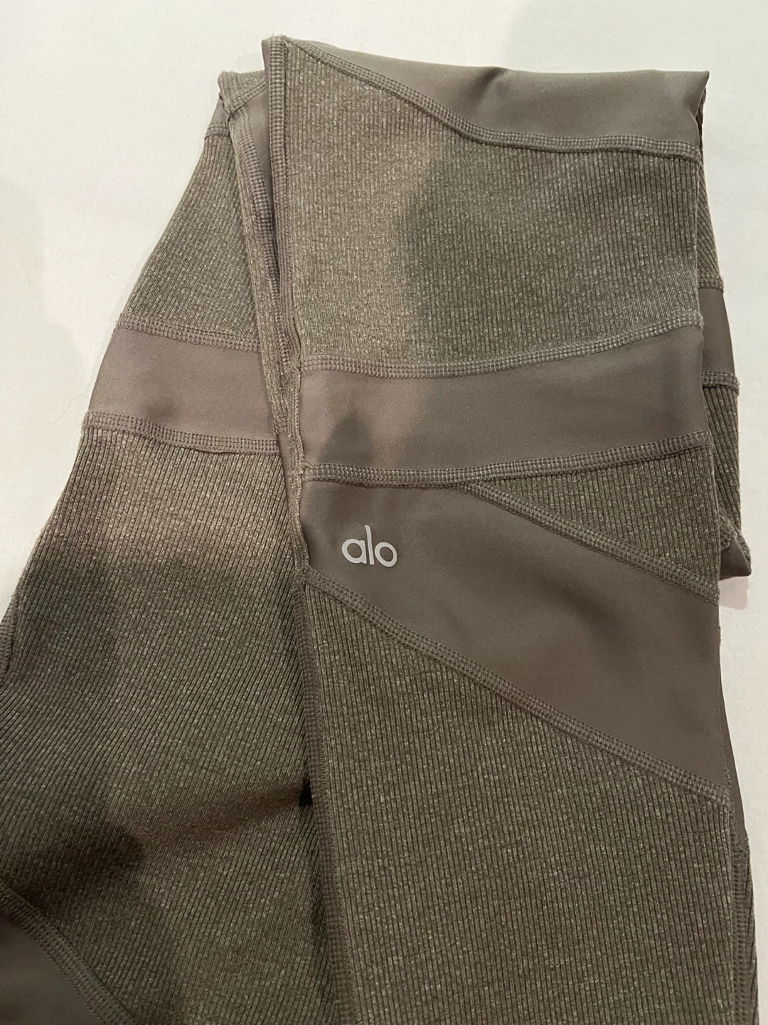 These Alo Yoga leggings feature a ribbed and smooth panel design. They are size medium. These are perfect for yoga or everyday wear! The color is Olive Branch and lighter than the pics show. Brand New, never worn.