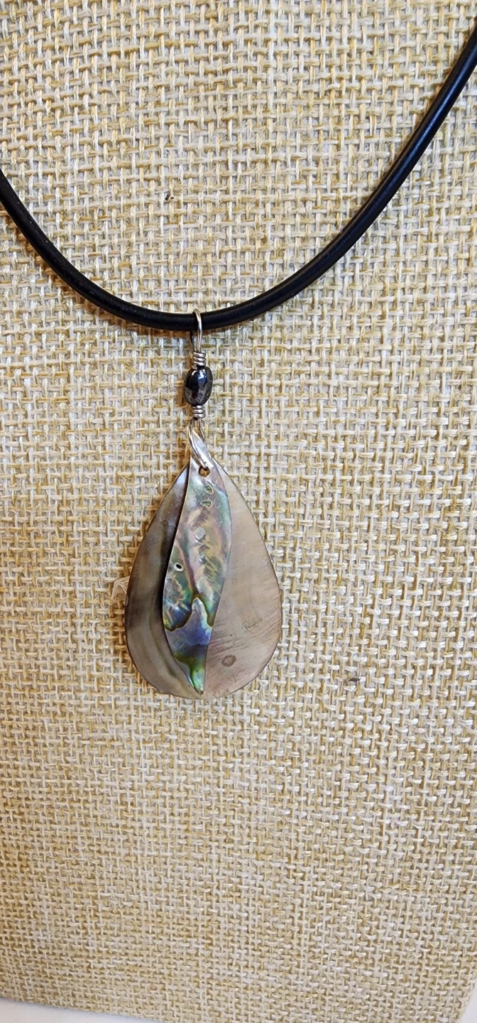 This is a lovely shell pendant necklace. It features a black cord and a layered shell pendant with iridescent accents. Perfect for adding a touch of natural elegance to any outfit