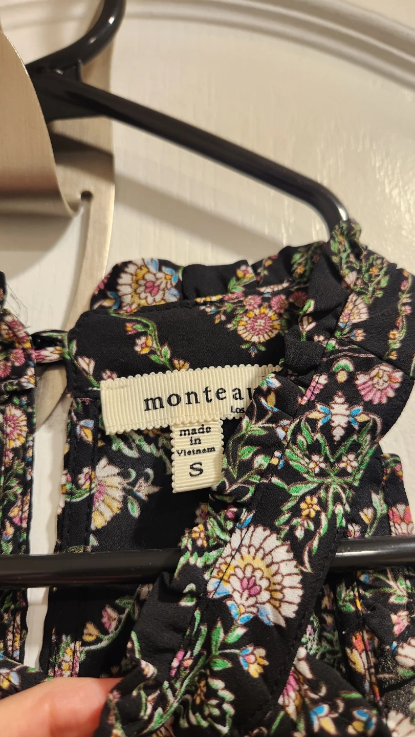 Selling a cute Monteal dress with a lovely floral pattern on a black background! It's a size small and in great condition. Perfect for a sunny day out!