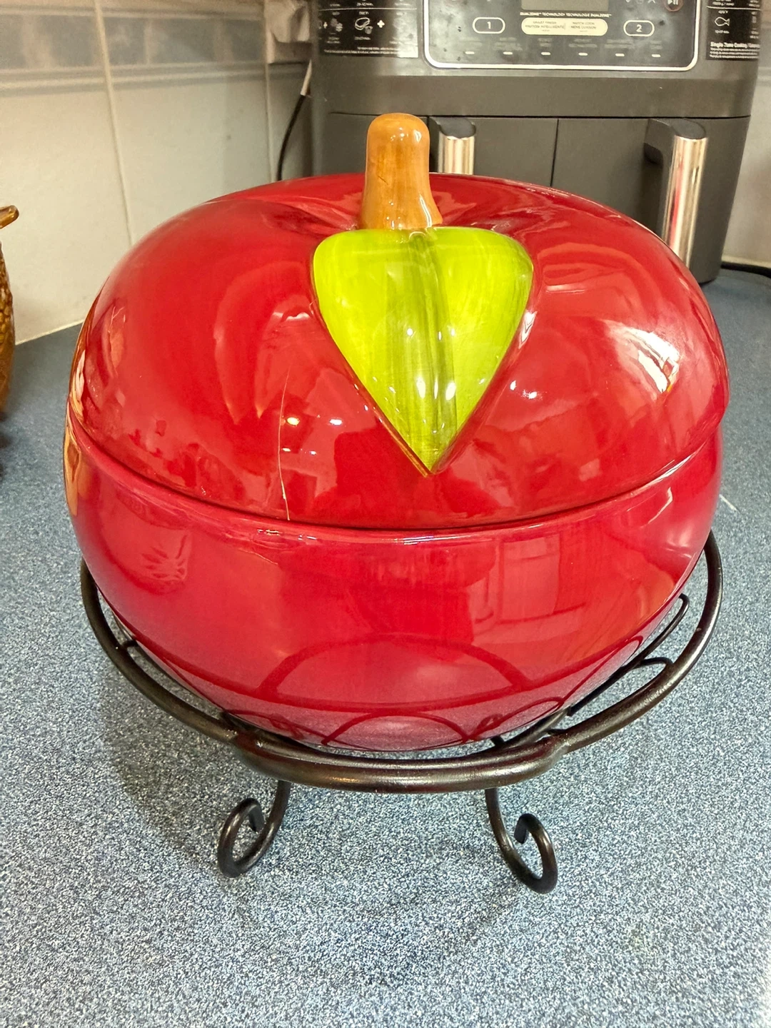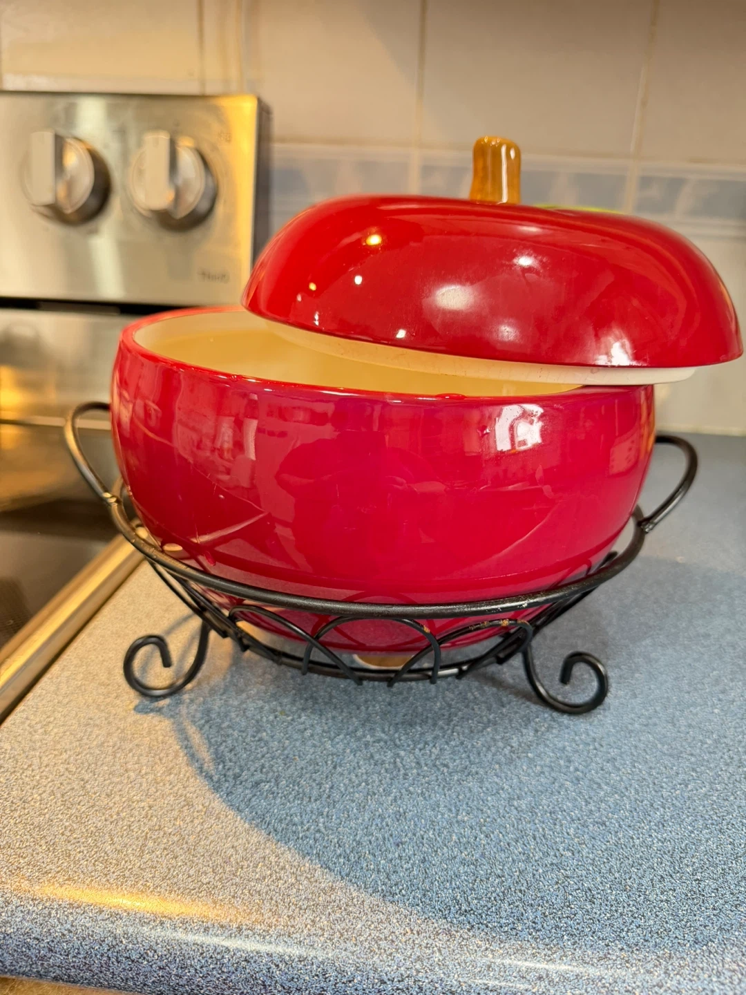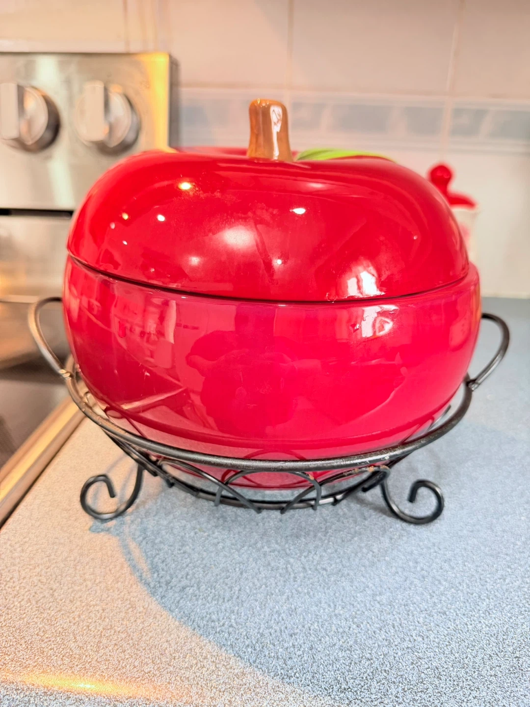 Ceramic baking serving bowl shaped like a red apple. It comes with a metal stand for serving. Perfect for desserts or side dishes!