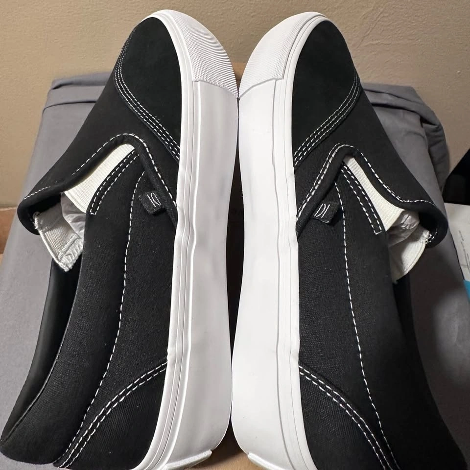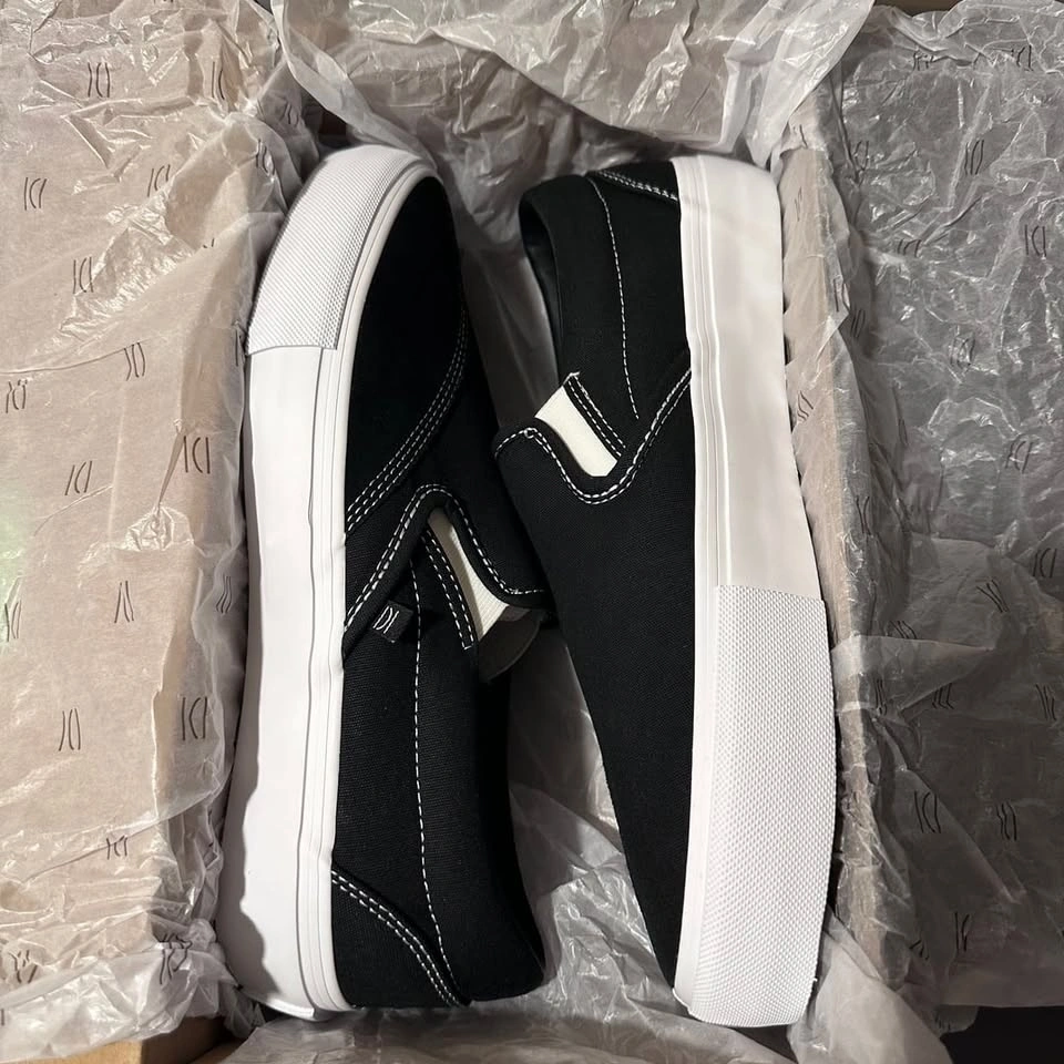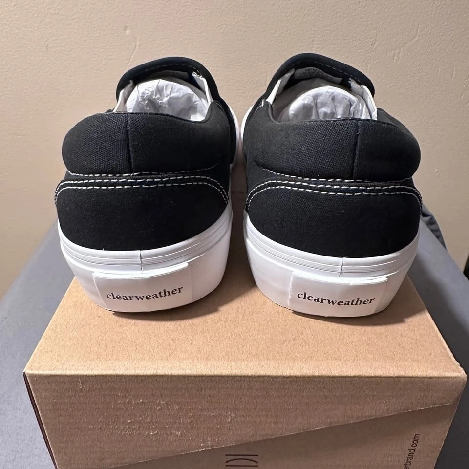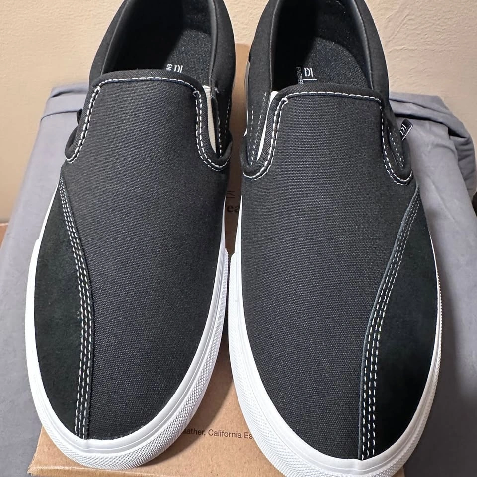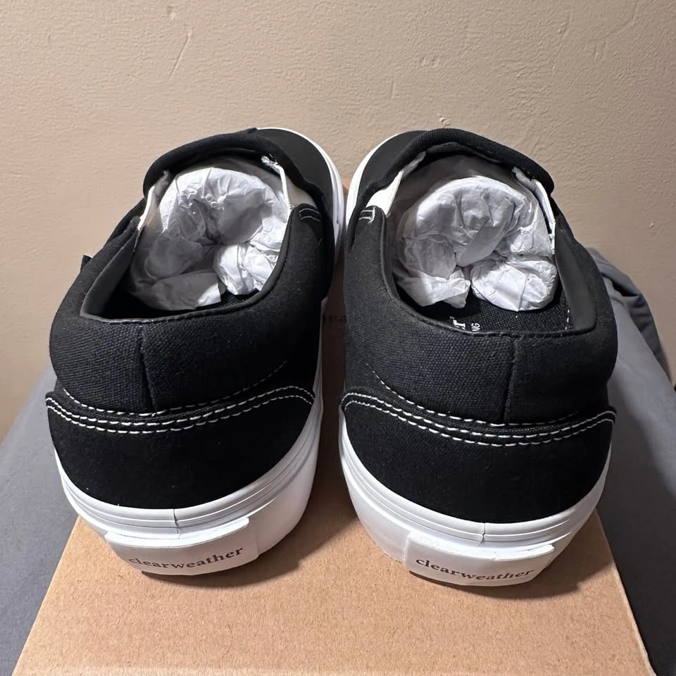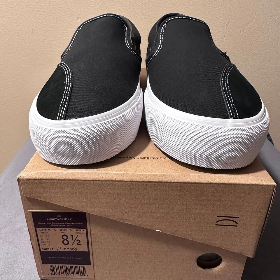 Clearweather Dodds Slip-On Skate Shoes in Black Canvas, Men's Size 8.5. This minimalist silhouette features a durable heavy canvas upper with reinforced contrast stitching and a vulcanized white platform midsole for superior board feel and style.