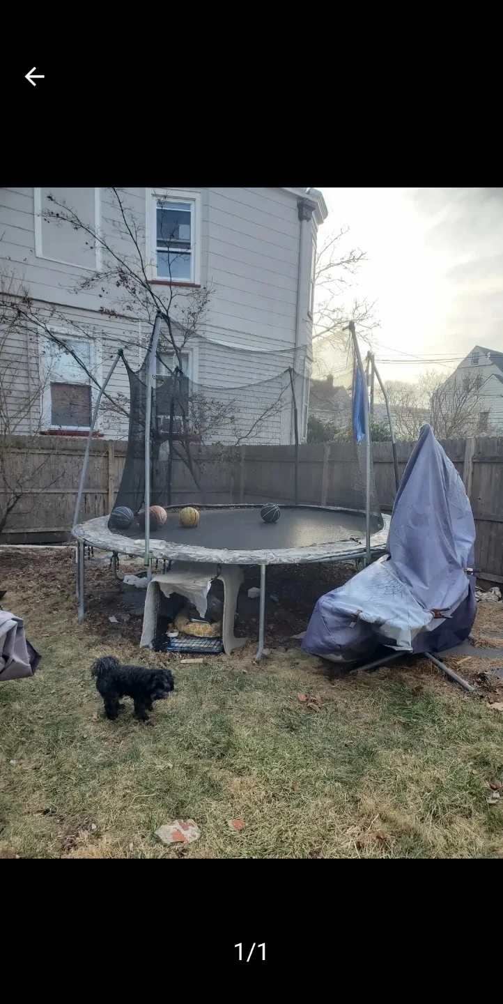 This is a round trampoline. It's about 10 feet in diameter and includes a safety net. Some balls are included. It's in a backyard setting.