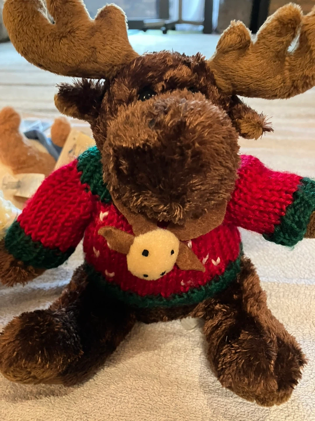 Selling a collection of cute plush toys! Included are a moose wearing a festive sweater, Peter Rabbit in his signature blue jacket, a jolly Santa Claus, and an adorable goat with a bell. They're all in excellent condition! Cash and pick up only!