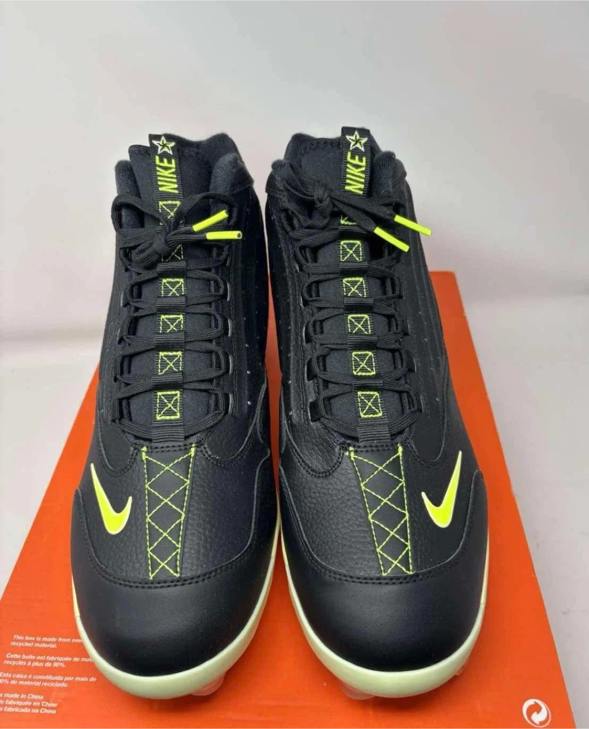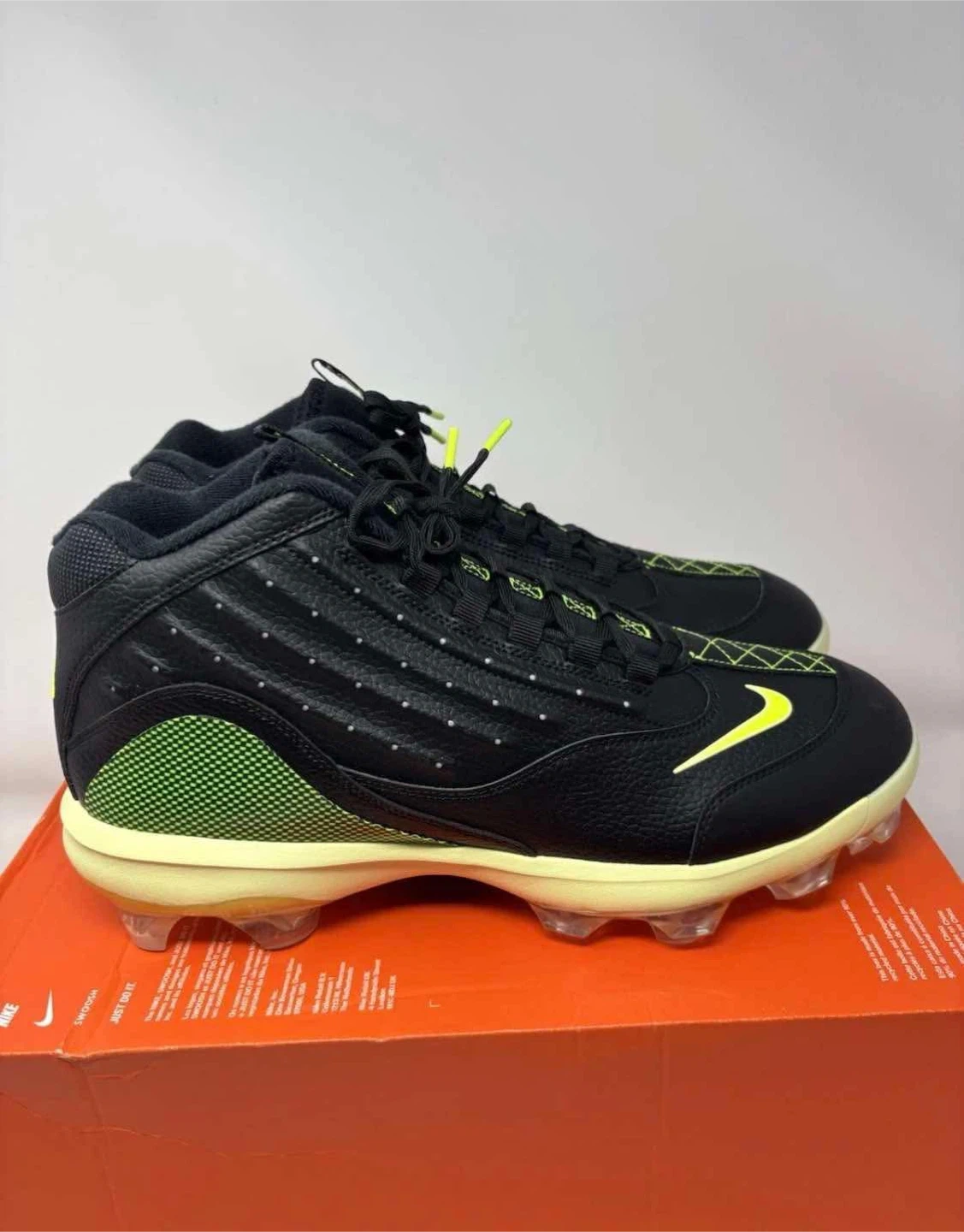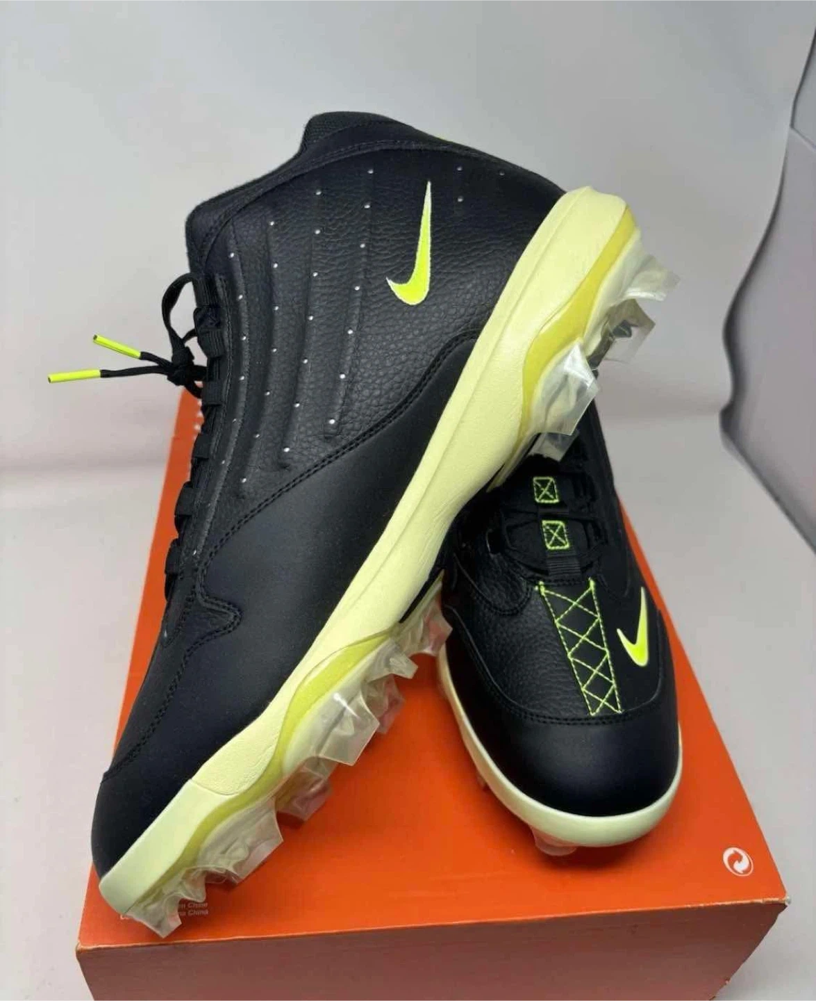 These are black Nike baseball cleats with neon yellow accents. They feature a mid-top design and clear molded cleats. Excellent for the baseball field!