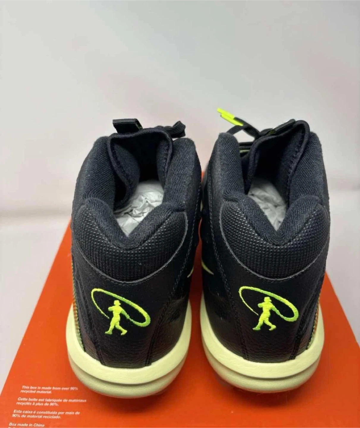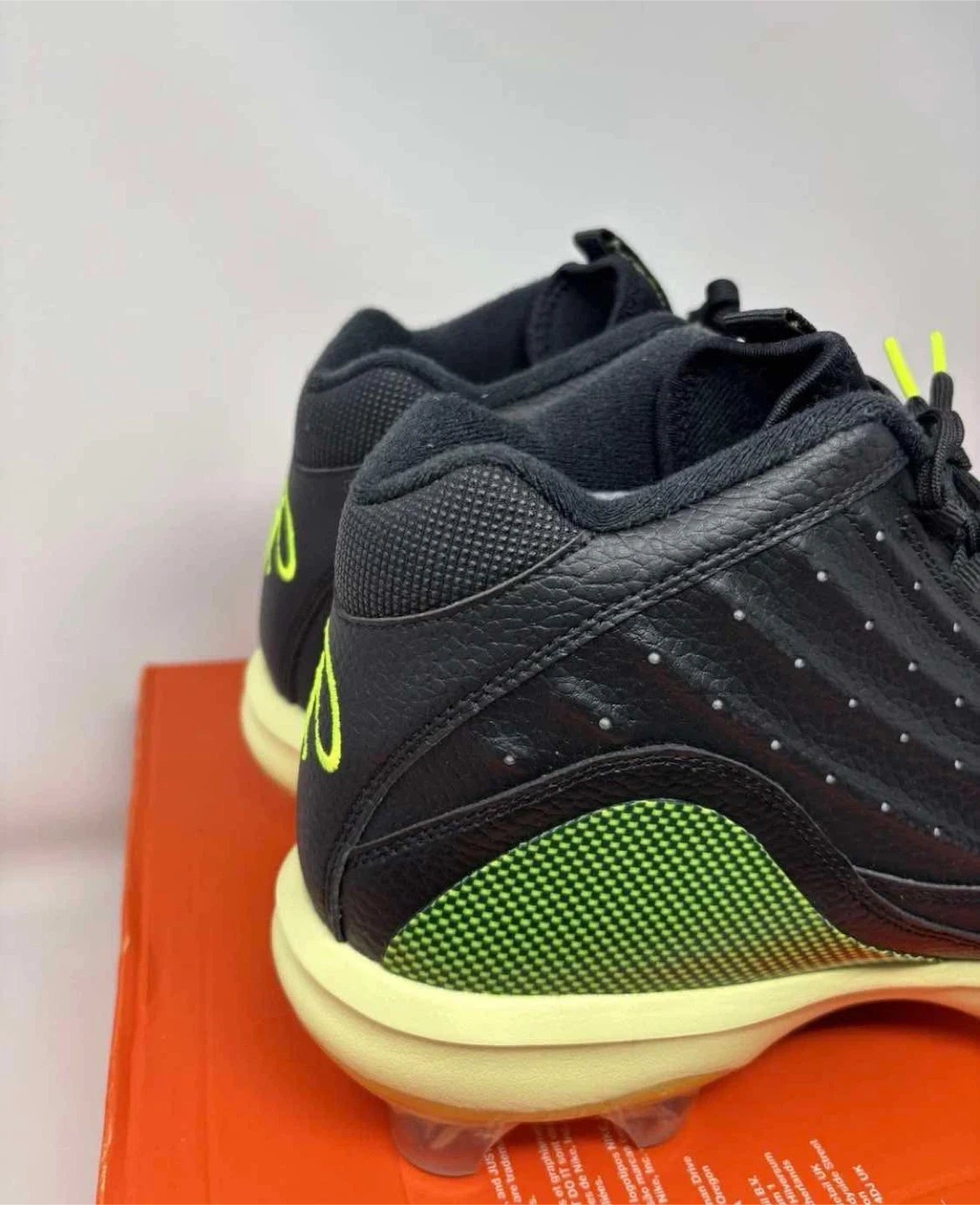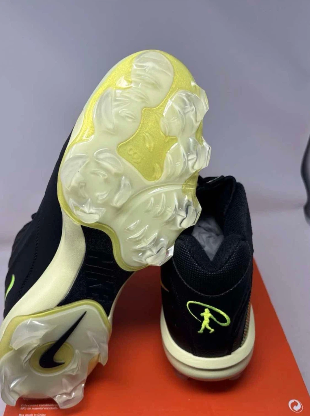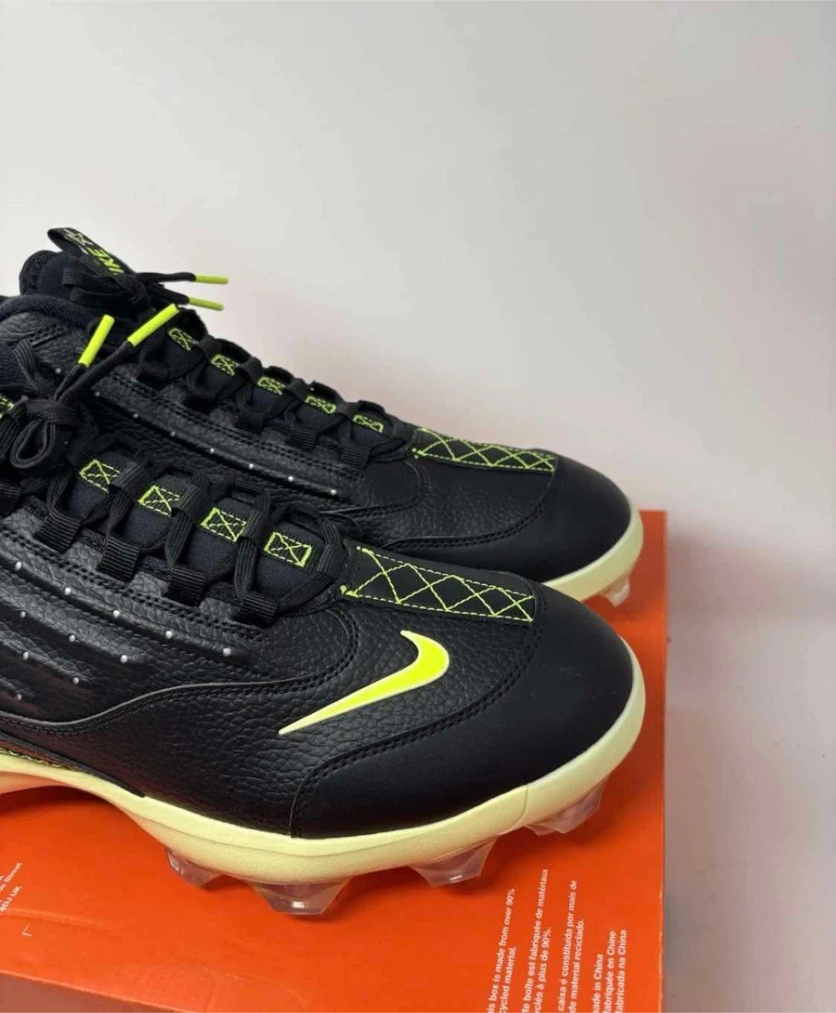 These are black Nike baseball cleats with neon yellow accents. They feature a mid-top design and clear molded cleats. Excellent for the baseball field!