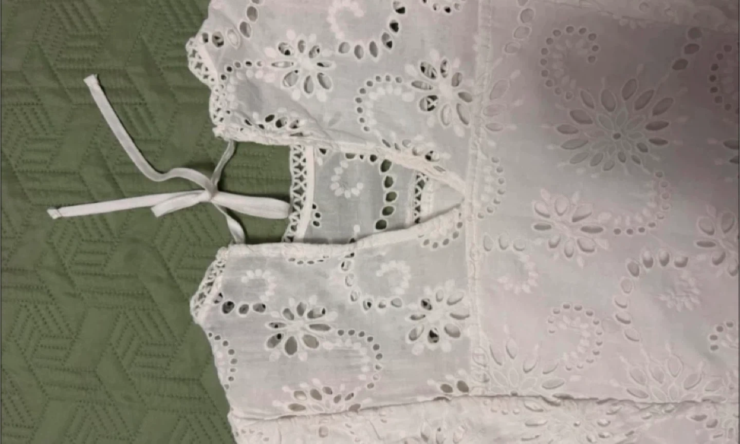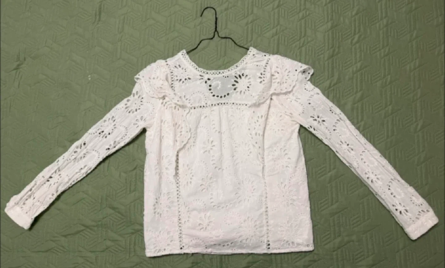 This white top features beautiful broderie anglaise detailing all over. It has a round neckline with a ruffled trim and long sleeves. The back has a tie closure.