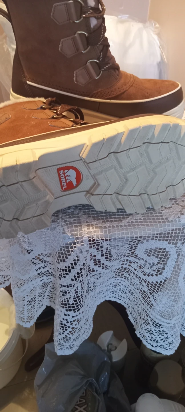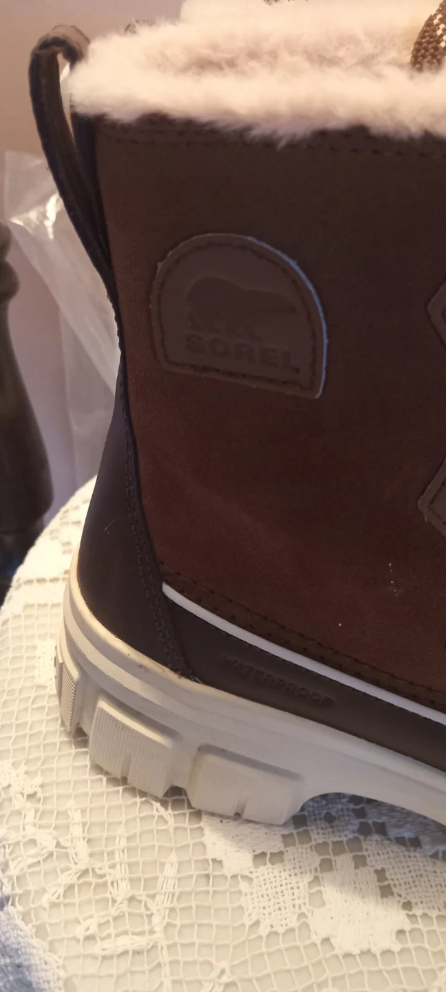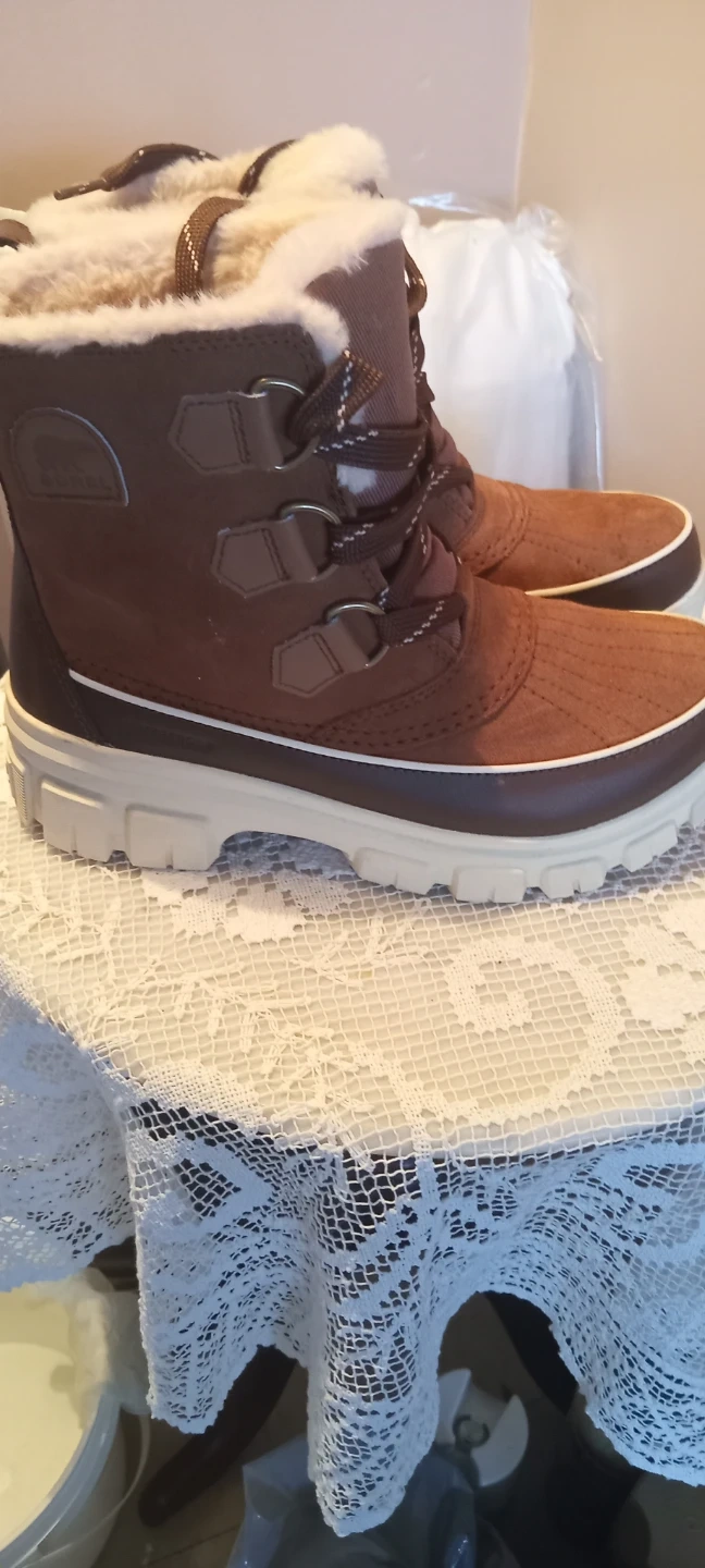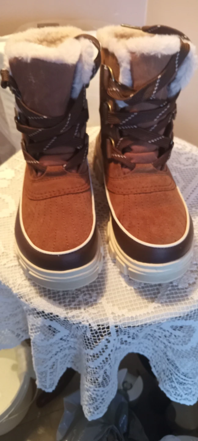These Sorel winter boots are brown and waterproof. They feature a lace-up front and a warm, fuzzy lining. Perfect for keeping your feet cozy during cold weather!