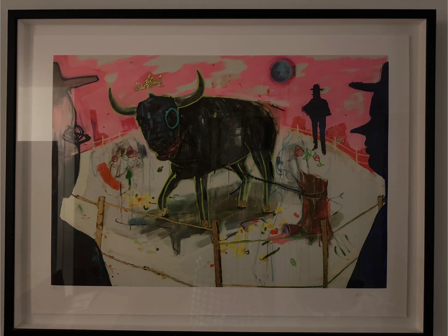This framed art print features a dark bull wearing a golden crown. The artwork has a vibrant pink background with abstract elements and silhouetted figures. It's a striking piece for any art enthusiast's collection!