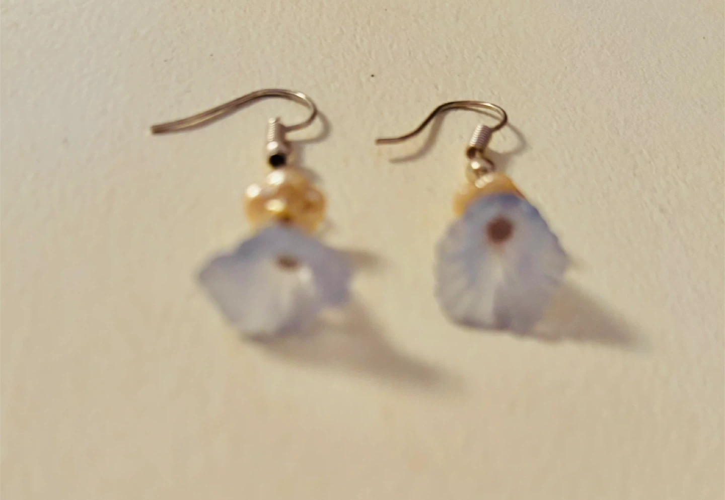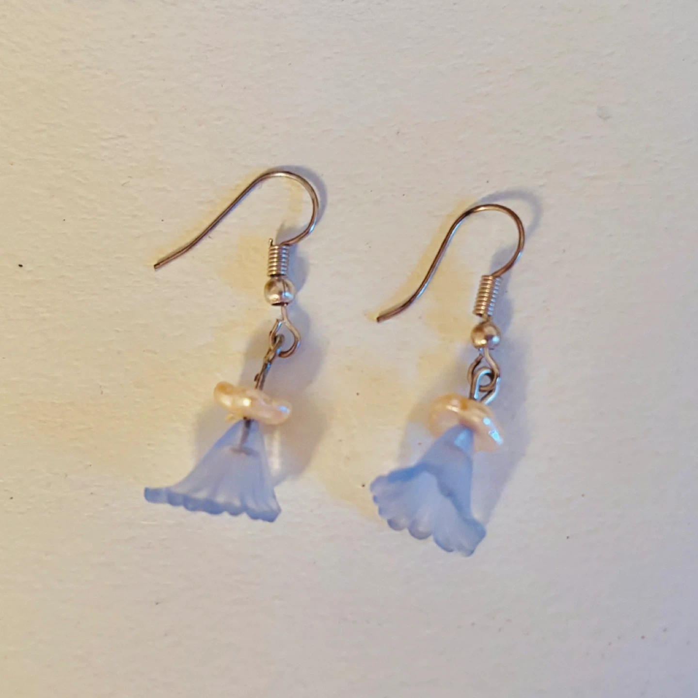 Cute blue flower dangle earrings with a small pearl accent. They're lightweight and have a delicate look. Perfect for adding a touch of whimsy to any outfit!