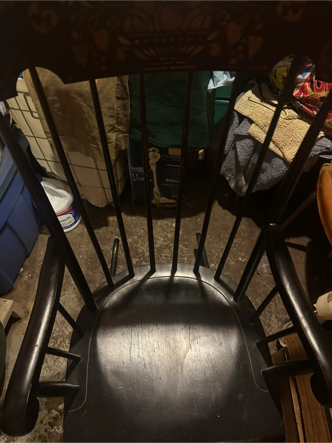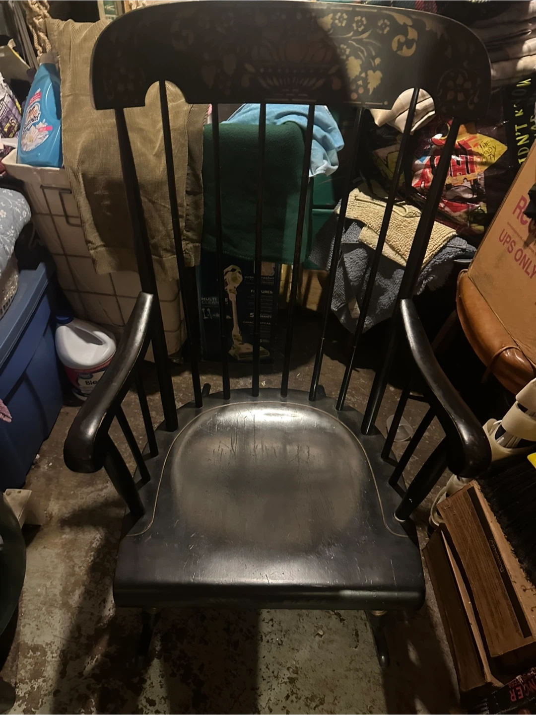 Selling a vintage black/ brown wooden rocking chair. It has a unique design and would be a great addition to any room! It is in good condition for its age and may need some wood glue to reinforce.