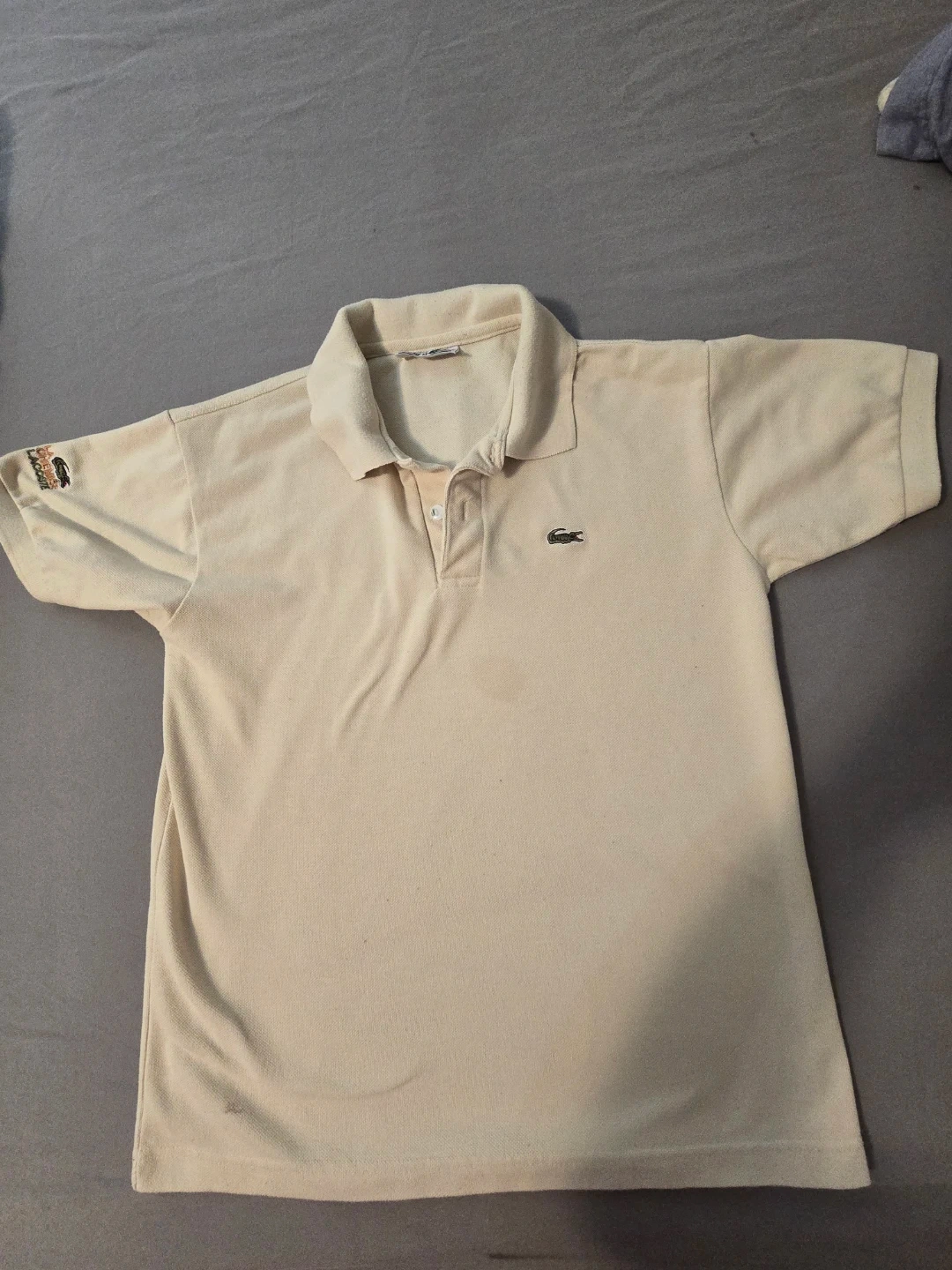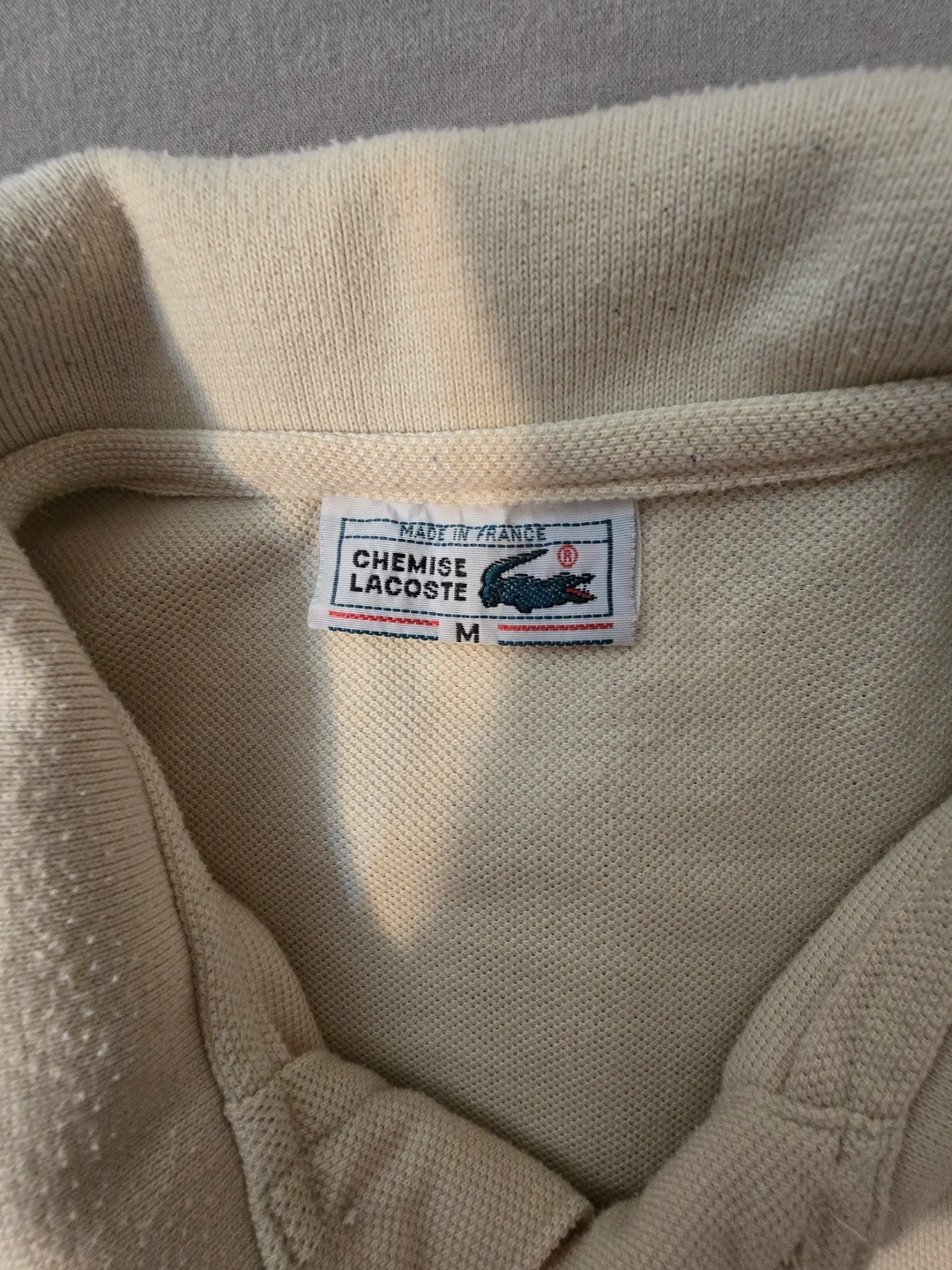 Classic beige Lacoste polo shirt. Made in France, size medium. Features the iconic crocodile logo.